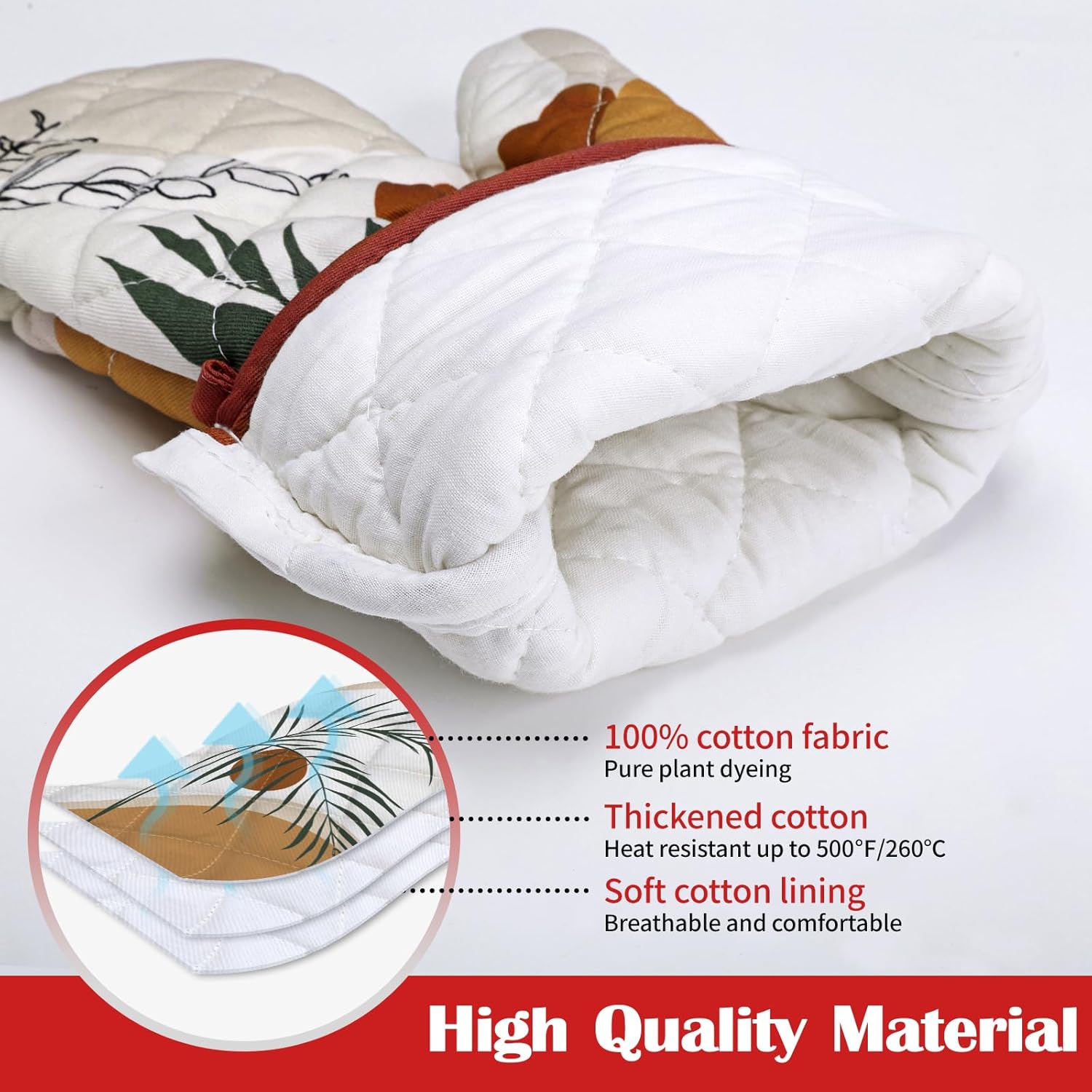 Boho Leaf Oven Mitts and Pot Holders Sets 2Pcs, 100% Cotton Heat Resistant, Vintage Extra Long Oven Gloves Potholder for Kitchen Cooking Baking Decoration