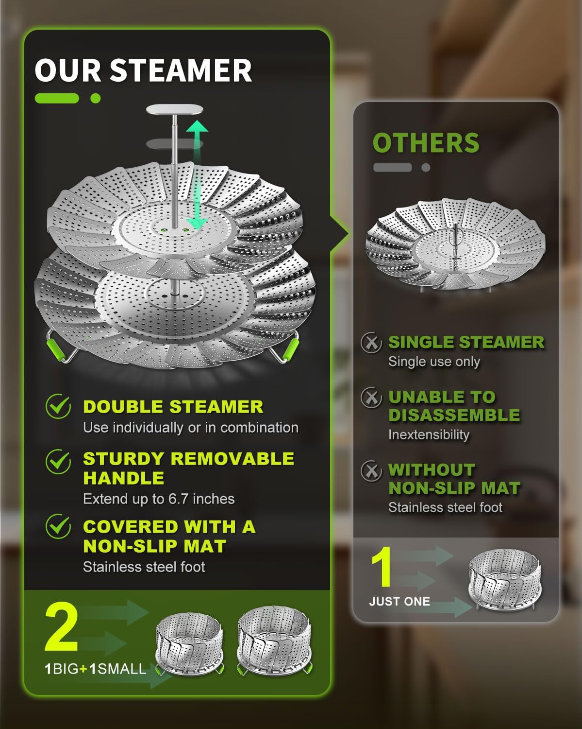 - 【2-Layer Steamer Basket for Extra Capacity】 Unlike single-layer competitors, our premium stainless steel steamer basket features dual stacking trays (7"-11" & 5.4"-9.2") that work as separate steamers or combined for 2x cooking space. Steam vegetables, dumplings, seafood, and baby food simultaneously - perfect for meal prepping and family cooking.