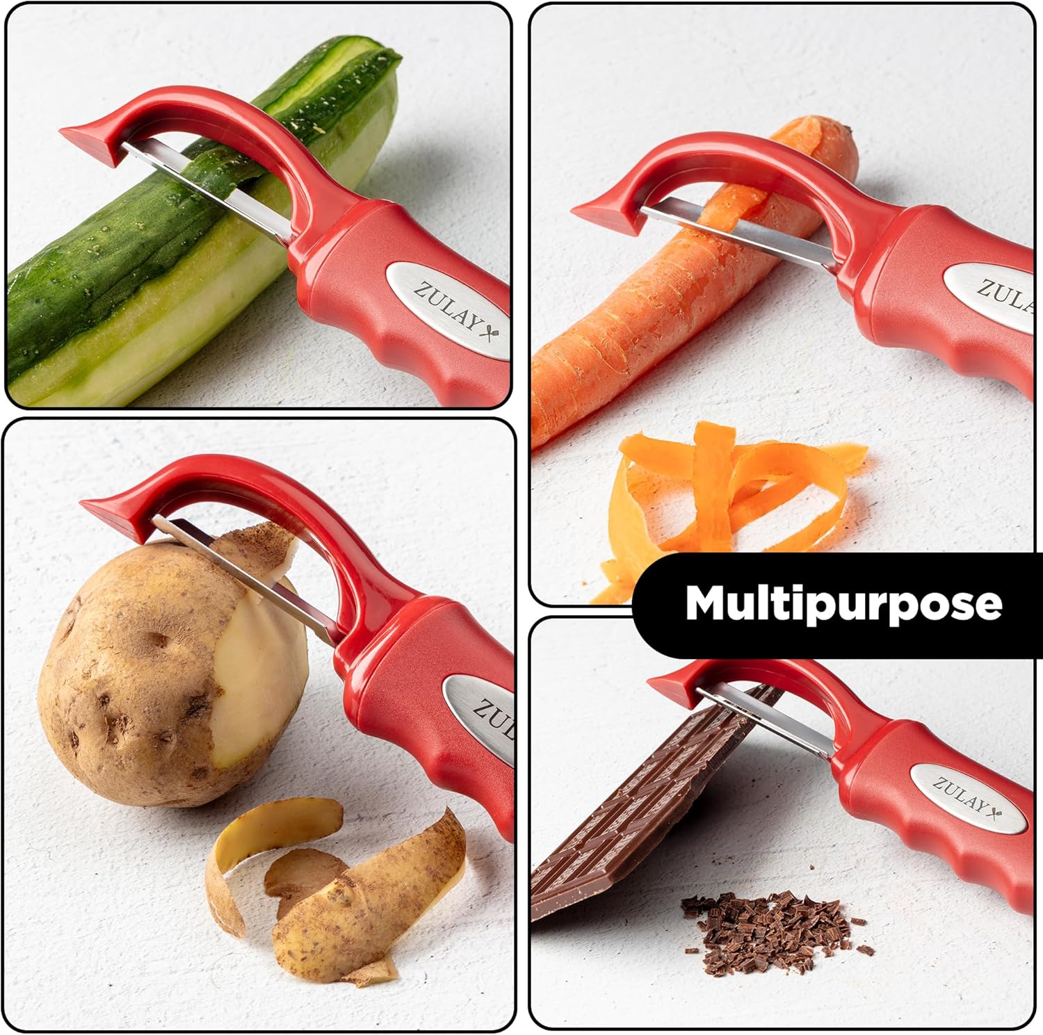 Zulay Kitchen Premium Vegetable Peeler for Kitchen - Swivel Peeler with Razor Sharp Stainless Steel Blades & Strong Ergonomic Handle - Dishwasher Safe, Easy To Use with Blemish Remover - Red