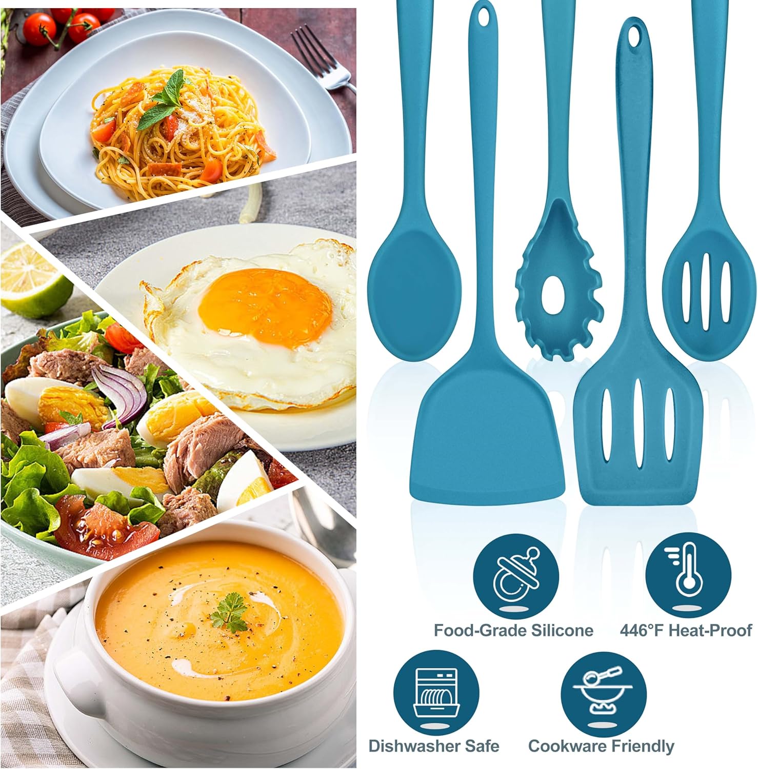 TeamFar Cooking Utensils Set, Silicone Kitchen Utensils of 5, Cooking Spoons Turners Pasta Server for Nonstick Cookware, Healthy & Heat-Resistant, Seamless & Non-Scratch, Dishwasher Safe, Dark Blue