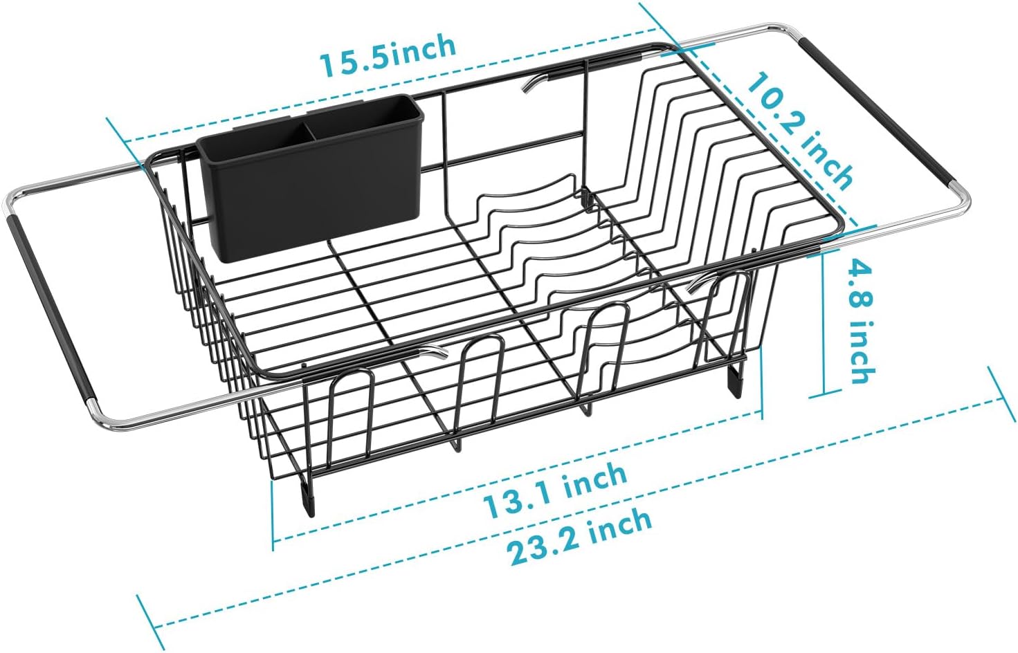 - 📏Two Independent Sliding Rods for Custom Fit: Customize width with dual slide and lock rods. Main frame remains compact while adapting to single, double, farmhouse sinks. Secure expandable dish drying rack stability. The ultimate extendable dish drying rack for 16" to 24" spaces