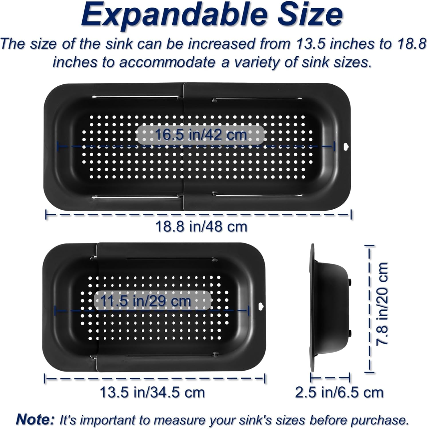 - [Large Capacity and Space Saving] The container can hold and release up to 5 quarts of food, including pasta, potatoes, broccoli, green beans, tomatoes, and other vegetables. The sink colander strainer basket has the capability to be conveniently increased in size from 13.5 inches (approximately 34.5cm) to 18.8 inches (approximately 48 cm) in order to accommodate various sink sizes. This adaptable structure is specifically designed to be easily placed without occupying excessive space.