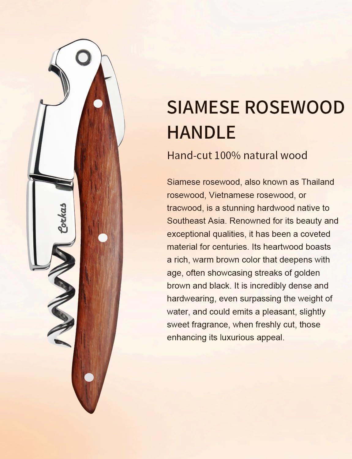 - ✅【HANDCRAFTED QUALITY & DESIGNED FOR COMFORT】Crafted from solid 430 stainless steel with a single-piece worm, the CORKAS wine opener is built to withstand years of use. The 100% manual assembly ensures exceptional quality you can depend on. The ergonomic, longer and premium rosewood handle with smooth edges is specifically designed for comfortable use, reducing hand fatigue during long shifts or frequent use at home. The polished metal finish adds a touch of sophistication to your wine service.