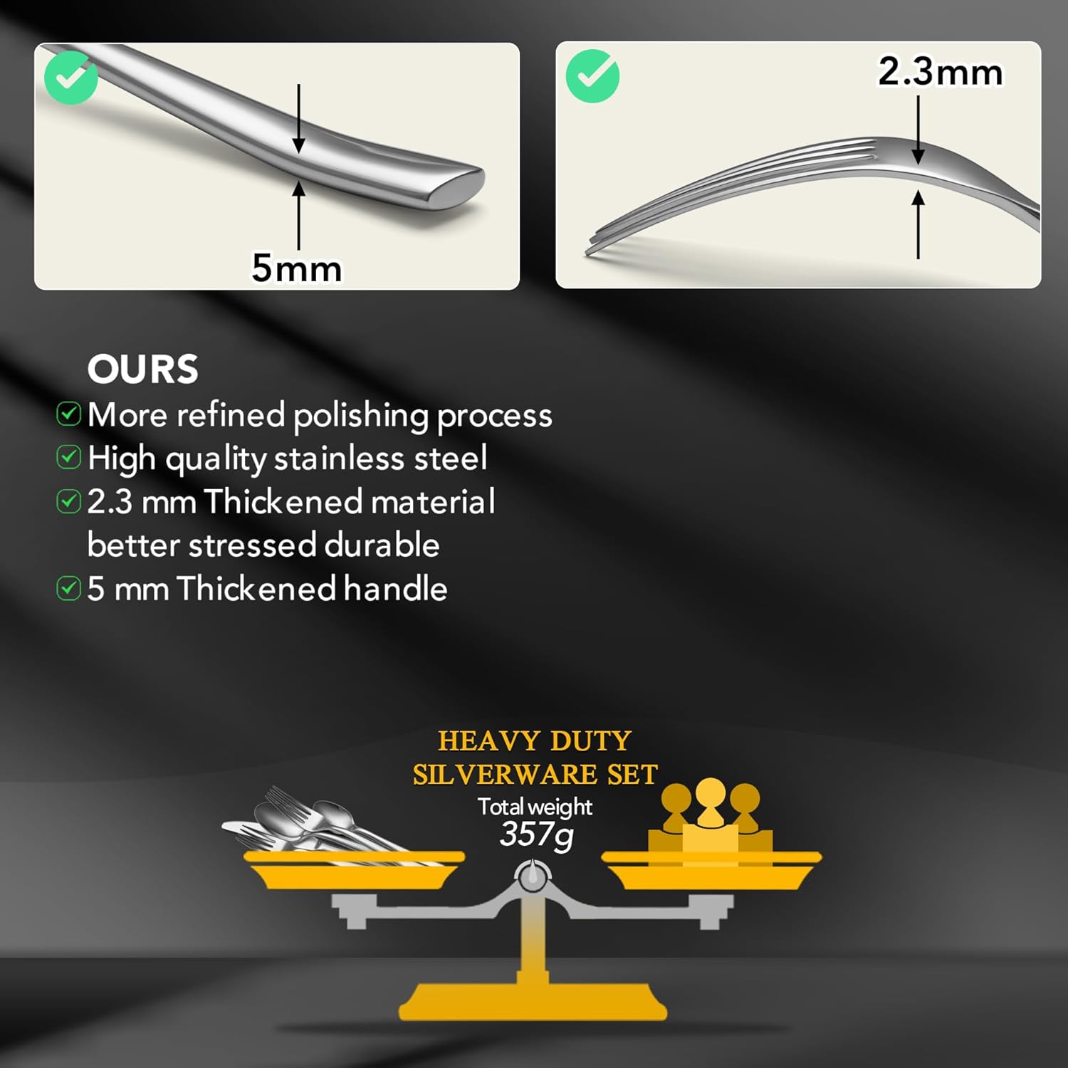 - ăStainless Steel Silverware Set Heavy WeightăThe forks and spoons silverware set is approximately 2 times thicker than a regular cutlery sets. More solid construction ensures everyday usage and durability, no worry about bending. The weighted silverware is made of high-quality stainless steel, which has great anti-corrosion and rust resistance to ensure eating health. Enjoy the benefits of stunning and reliable utensil sets for years to come