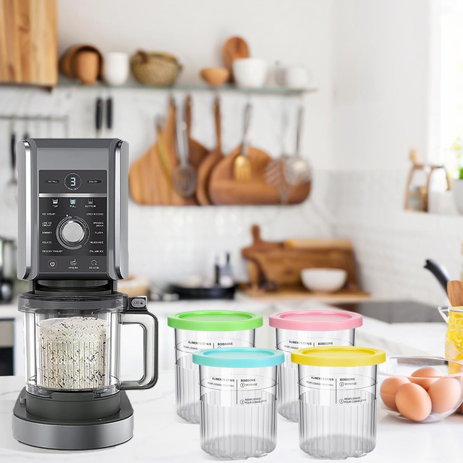 - What You Get: 4 pints with different color lids and spoons.Different colored lids allow you to easily distinguish the taste of ice cream, and the large capacity can meet the needs of families.Before purchasing, please confirm that the size of the pint is compatible with your device.Do not exceed the pint maximum capacity line