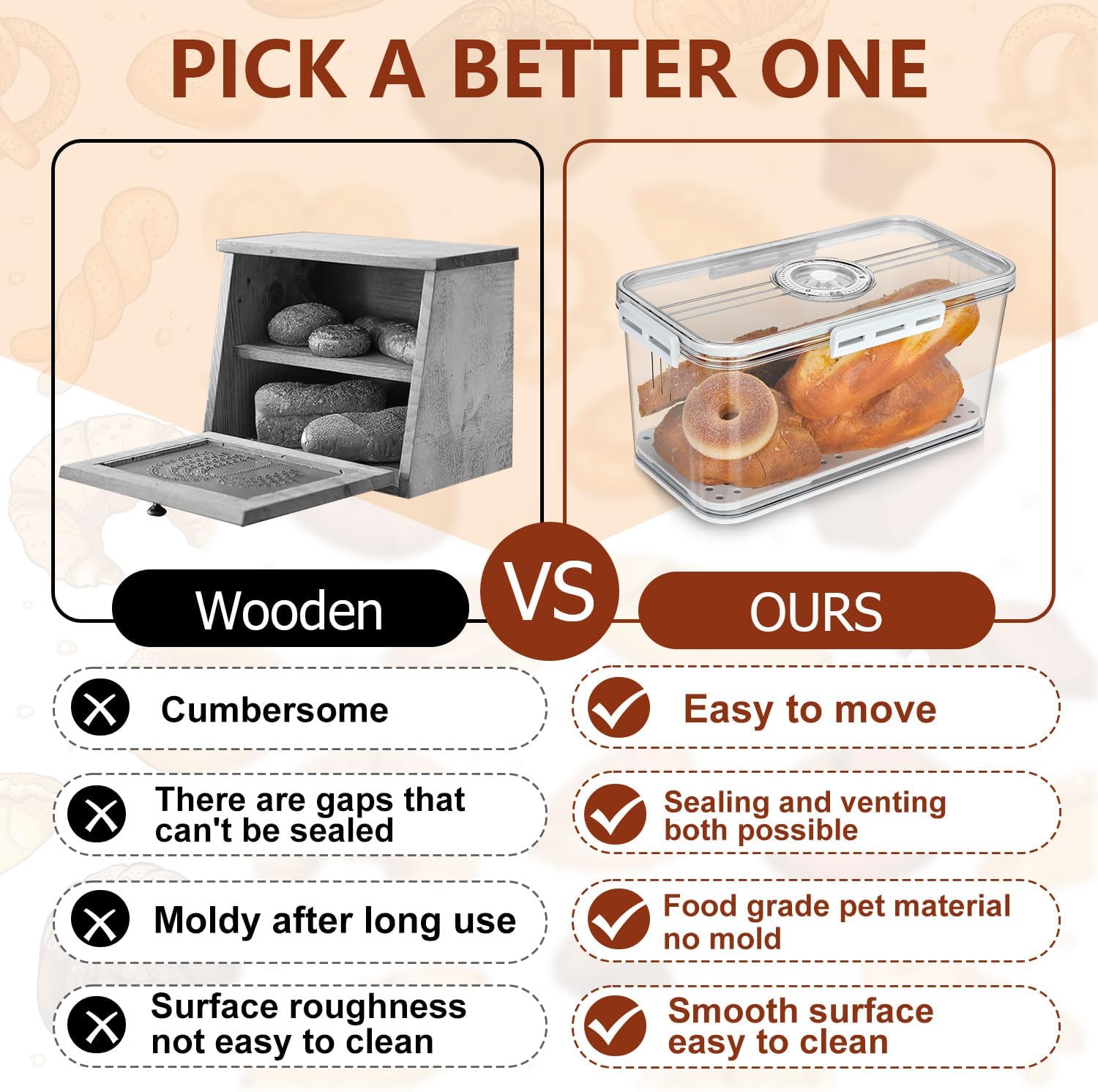 - Why choose our bread box: Compared with the long strip shape bread container,our bread storage box is wide and suitable for putting different shapes of bread.Compared to the wooden breadbox,our bread storage container is easy to clean and the material of the bread keeper box will not get moldy after years.Our bread bin is sealed for resistant to moisture.Have an air valve on the bread box lid,optionally release hot bread airflow or seal against moisture