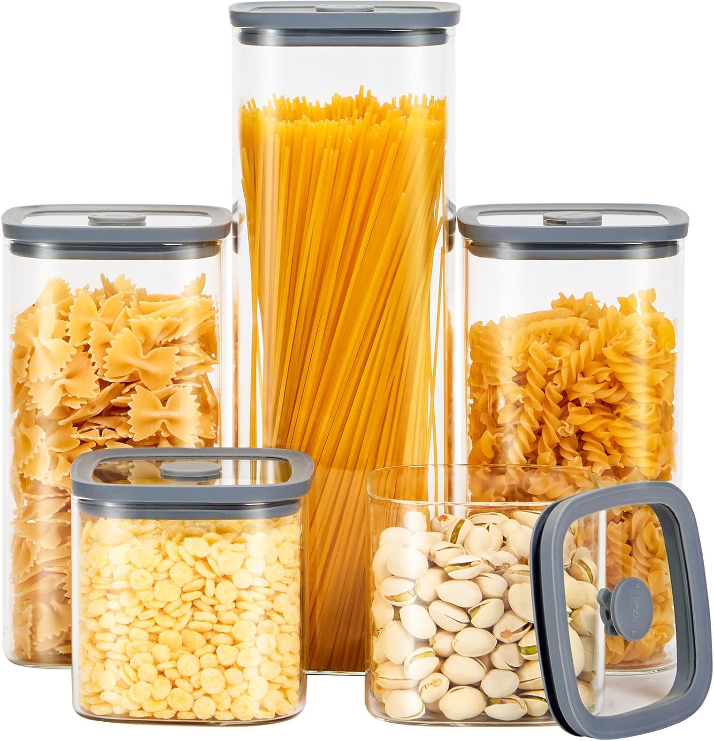 Square Glass Food Storage Jars with Lids[Set of 5], Perfect for Pasta, Cookies, Nuts, Coffee, Cereal, Flour,Organize Your Kitchen with these BPA-Free Glass Jars with Silicone Lids