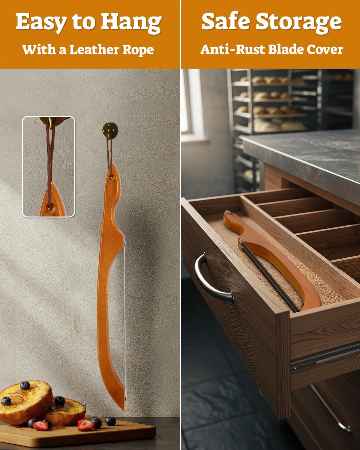 - Premium Bow Body: Crafted from Pine wood, the sourdough bread baking supplies feature a beautifully designed bow body that not only enhances aesthetic appeal but also provide exceptional durability. The natural properties of this bread cutter make it resistant to moisture and decay, ensuring a long-lasting tool for your kitchen. The ergonomic design of the bread knife for homemade bread allows for a comfortable grip, making slicing effortless