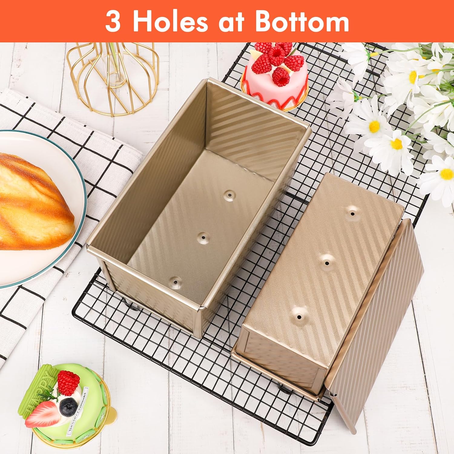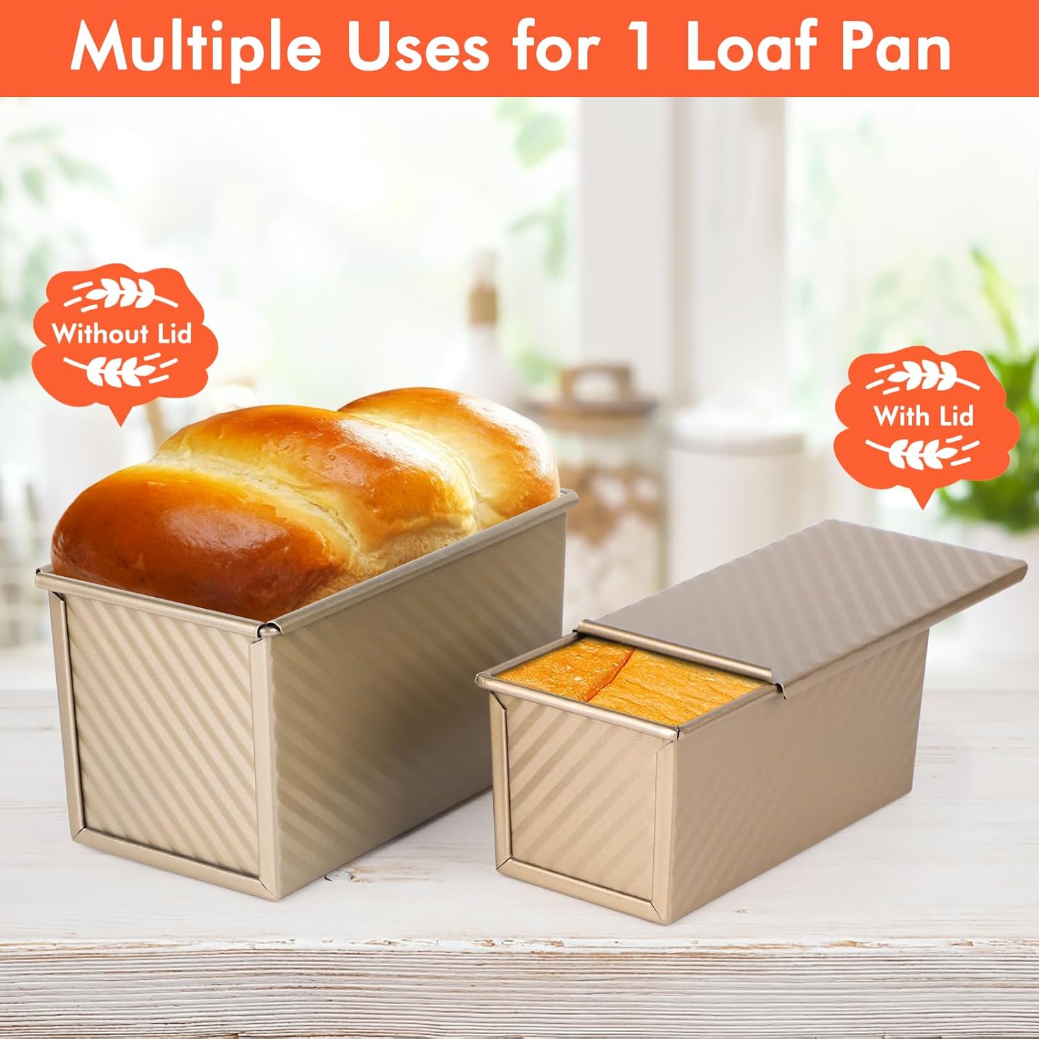 Beasea Pullman Loaf Pan with Lid, 2 Pack Non-Stick Bread Loaf Pans 1 lb & 0.5 lb Carbon Steel Bread Toast Box with Dough Scraper for Homemade Bread Toast Oven Baking - Gold
