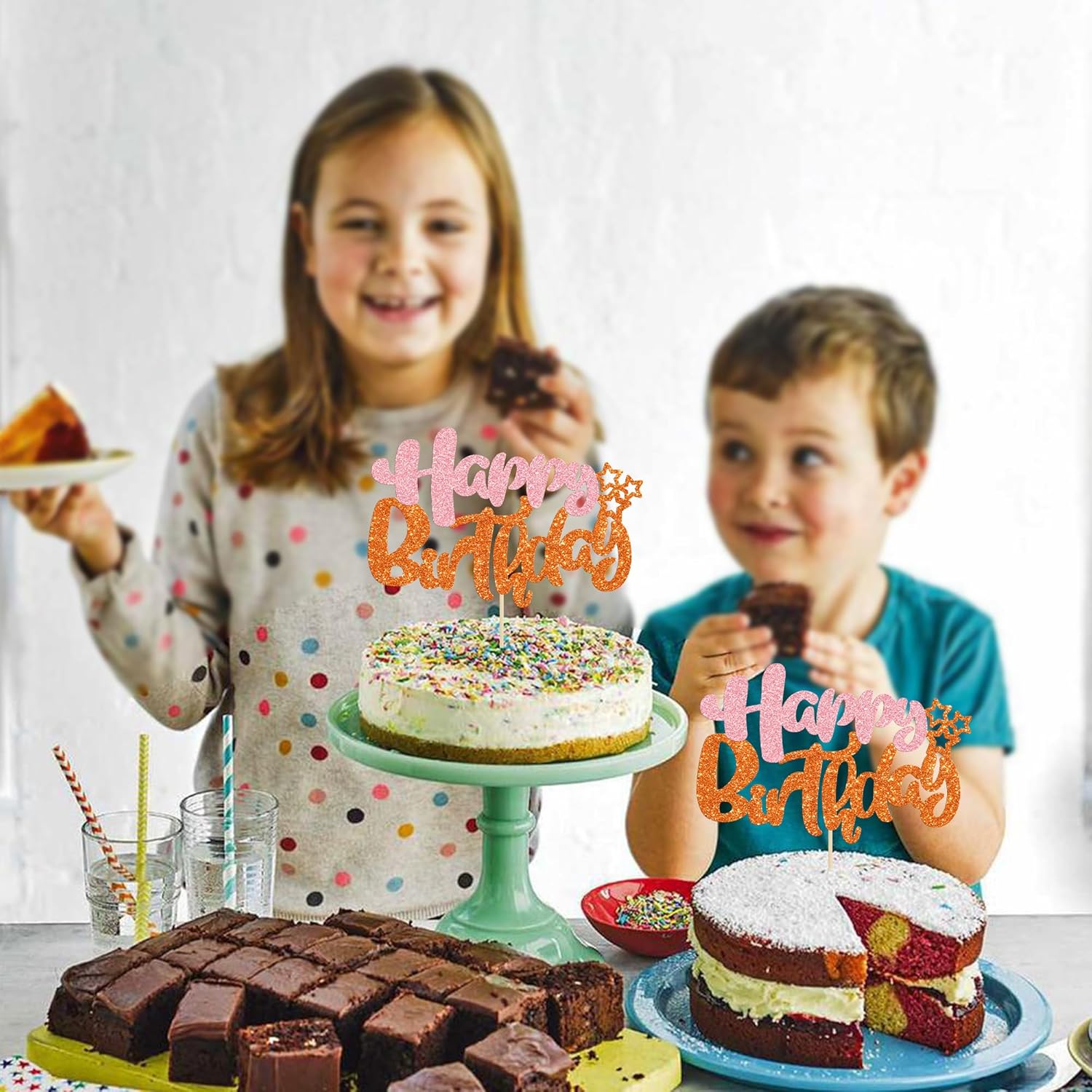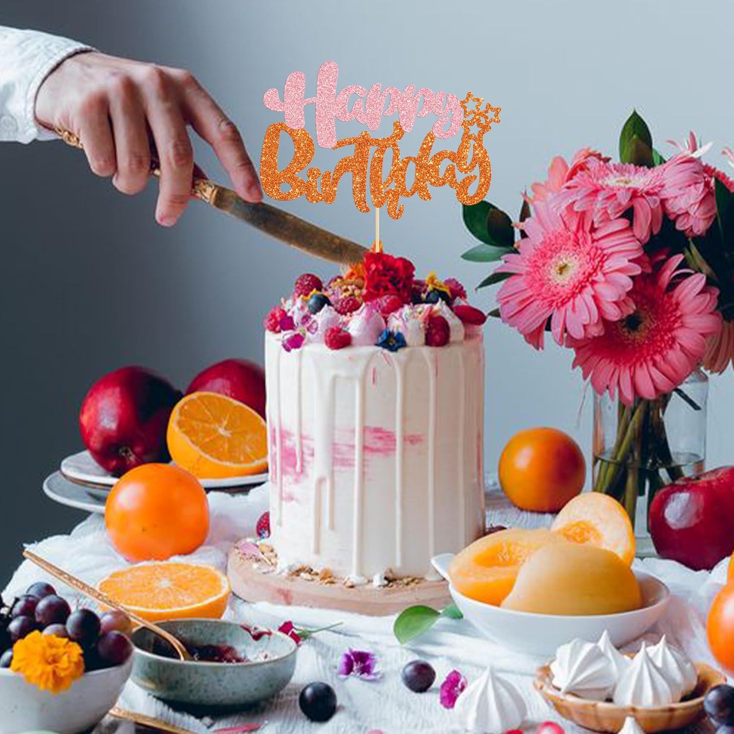 Ephlyn 1Pcs Happy Birthday Cake Topper Glitter Cake Pick for Celebrating Anniversary Party Cake Decorations Supplies Pink Orange