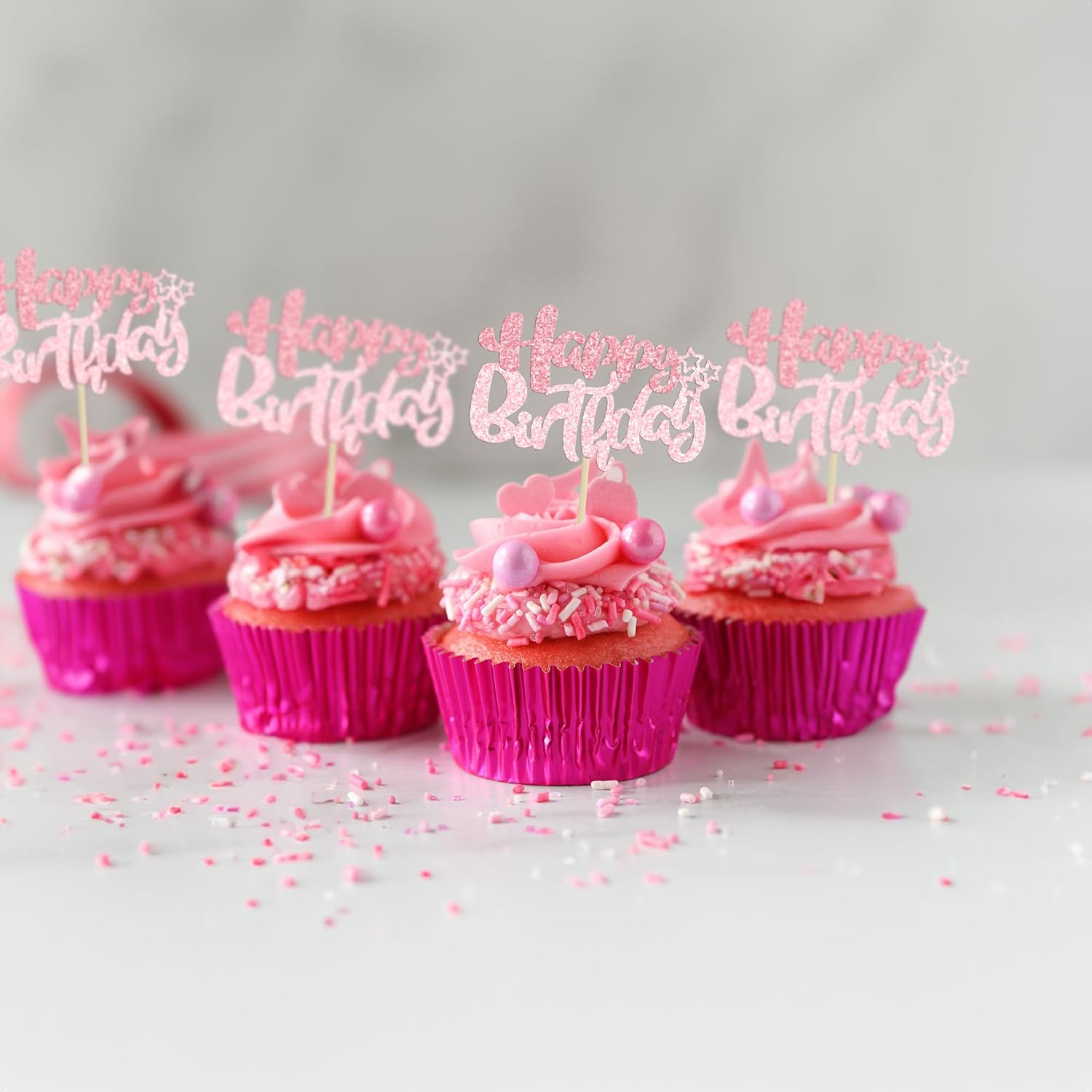 Ephlyn 24Pcs Pink Light Pink Happy Birthday Cupcake Toppers for Baby Shower, Kids Boys Girls Birthday Anniversary Party Cake Decorations