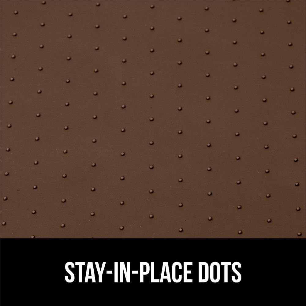 - STAYS IN PLACE: designed to lay flat and grip your cabinets, mat stays in place with daily use taking items in and out; raised silicone dots on the topside help prevent items from slipping and sliding around the mat
