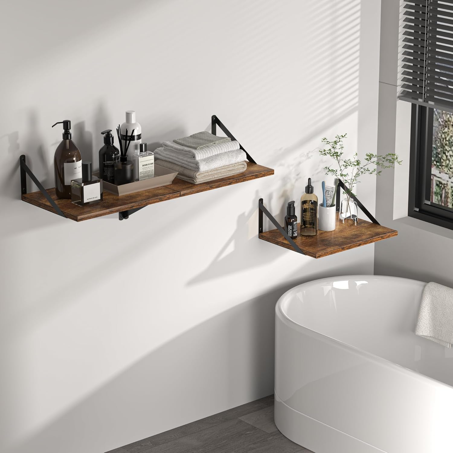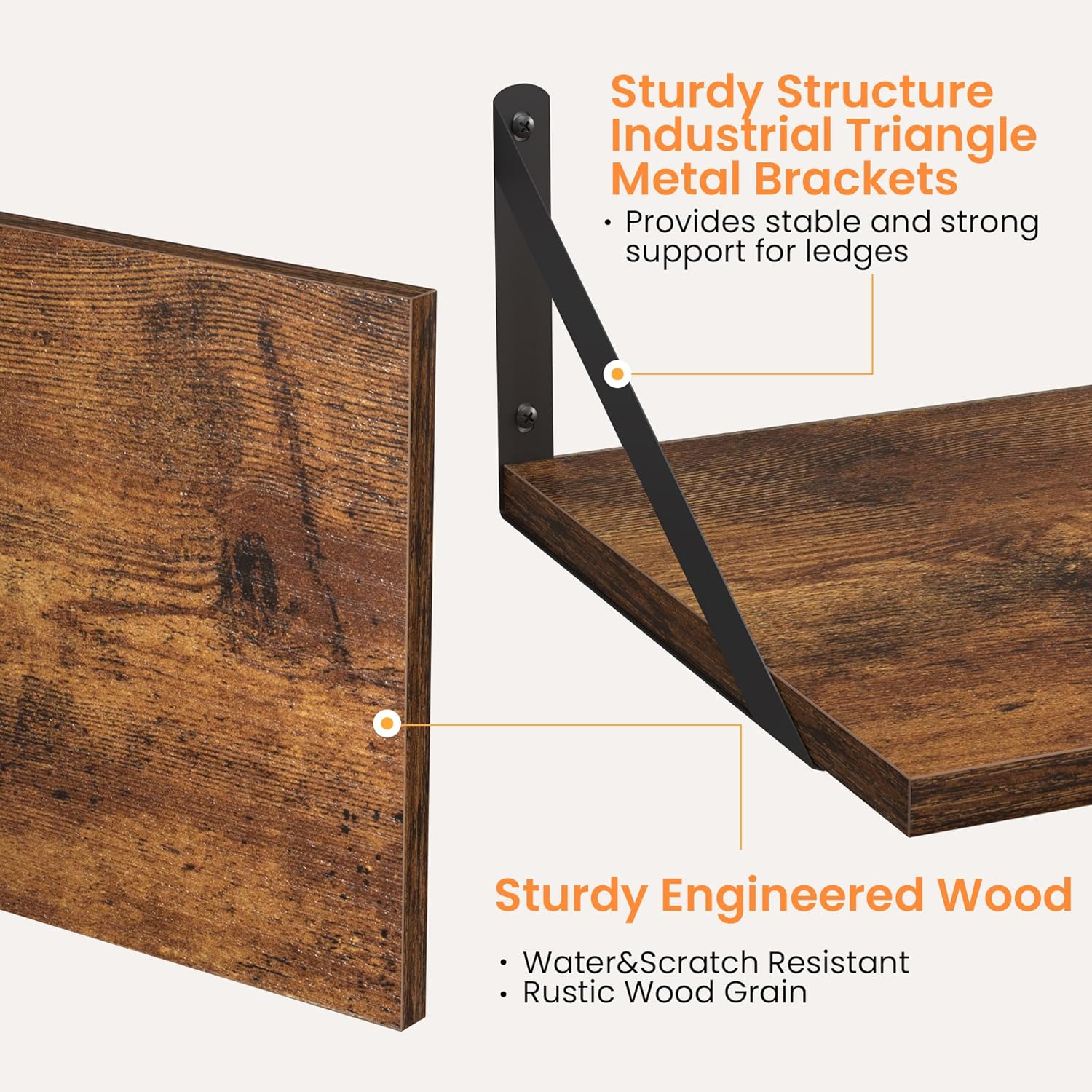 Heimlove Deep Floating Shelves for Wall, 16W x 12D Wood Wall Shelves Set of 2, Wide Floating Bookshelf for Living Room, Kitchen, Office, Bedroom and Decor Storage, with Metal Bracket - Rustic Brown