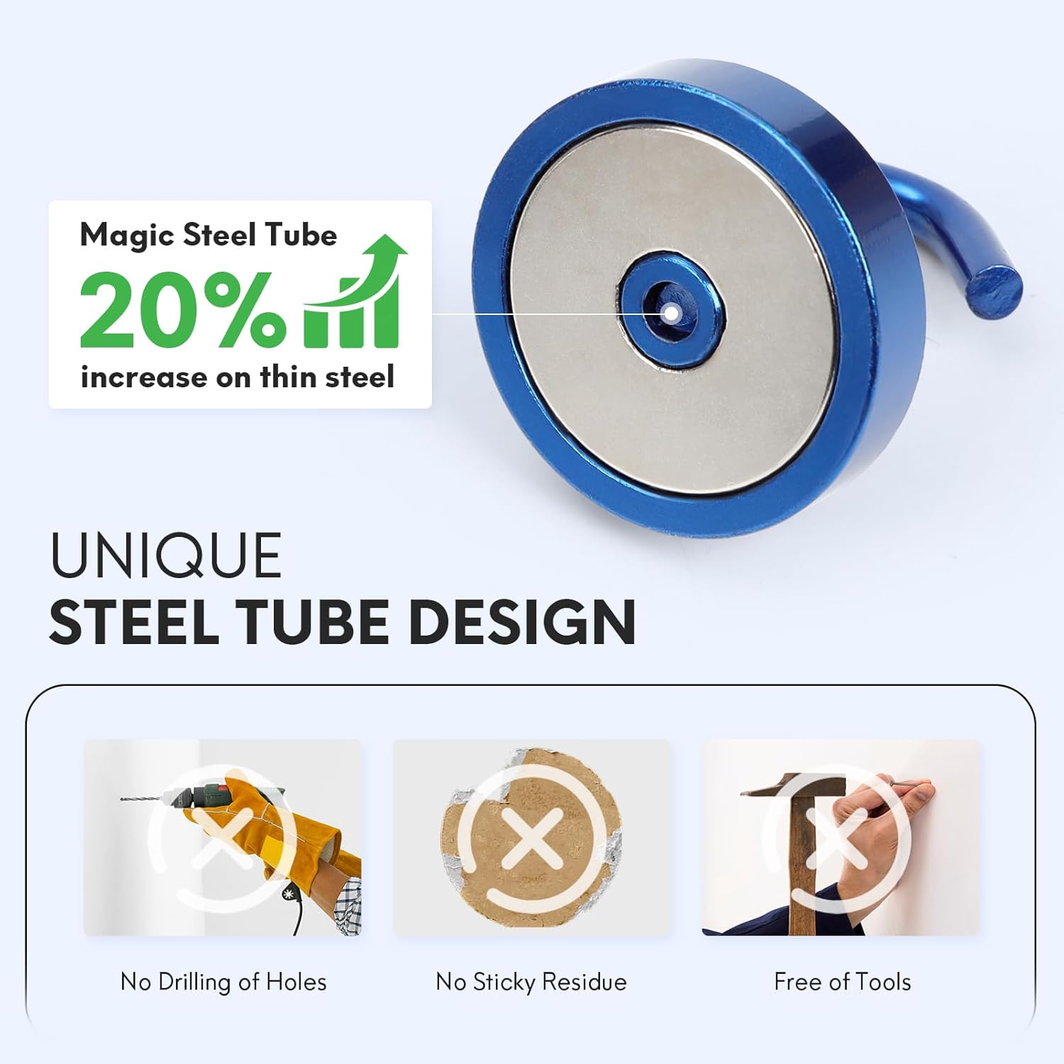- ✔MAGIC STEEL TUBE DESIGN - Unique design of steel tube inside the base of magnetic hooks greatly increases the attractive force , especially on thin steel! It increase approximately 20% force comparing those none-tube magnets. it solves the problem of weak force on thin steel. Permanent magnetic hook with magic steel tube, strong magnetism lasts forever!