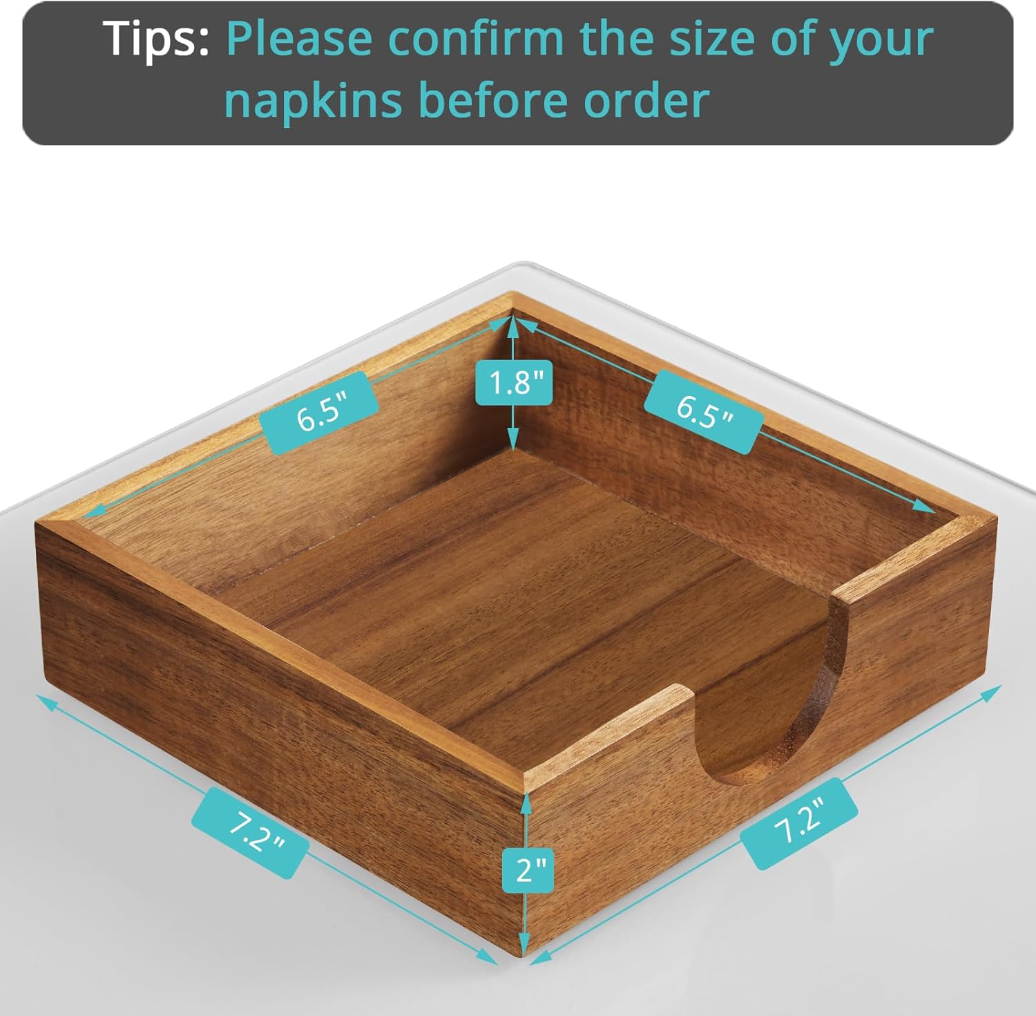 - Perfect Size for Various Napkins: This wooden napkin holder measures 7.2" by 7.2" (Internal size: 6.5" by 6.5") and is the perfect size to hold luncheon, dinner, beverage or cocktail napkins, coasters, or memos, and also fits other standard guest towel/buffet napkins. PLEASE CONFIRM THE SIZE OF YOUR NAPKINS BEFORE ORDER.