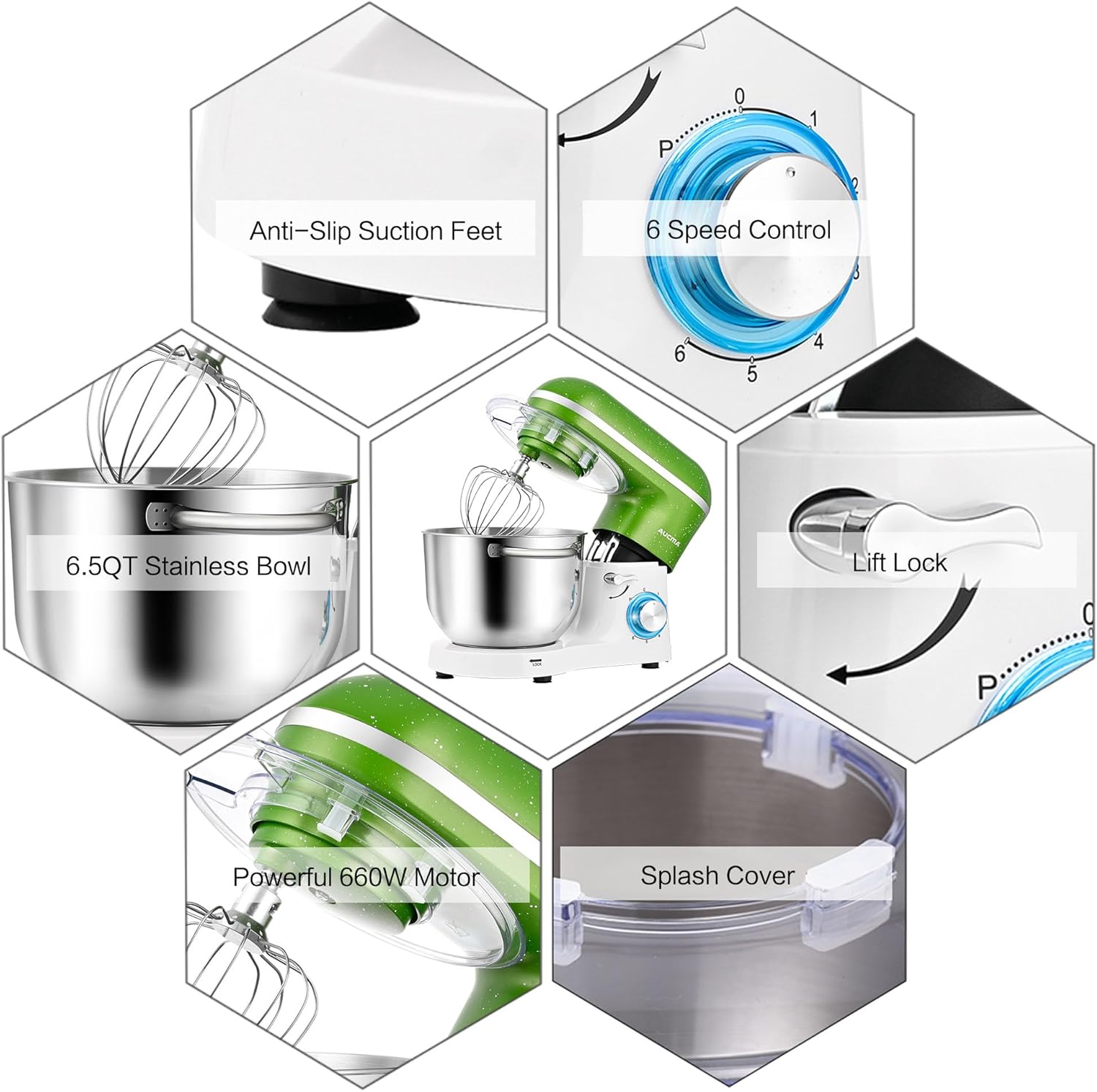 Aucma Stand Mixer,6.5QT 660W 6-Speed Tilt-Head Food Mixer, Kitchen Electric Mixer with Dough Hook, Wire Whip & Beater (Green-White, 6.5QT)