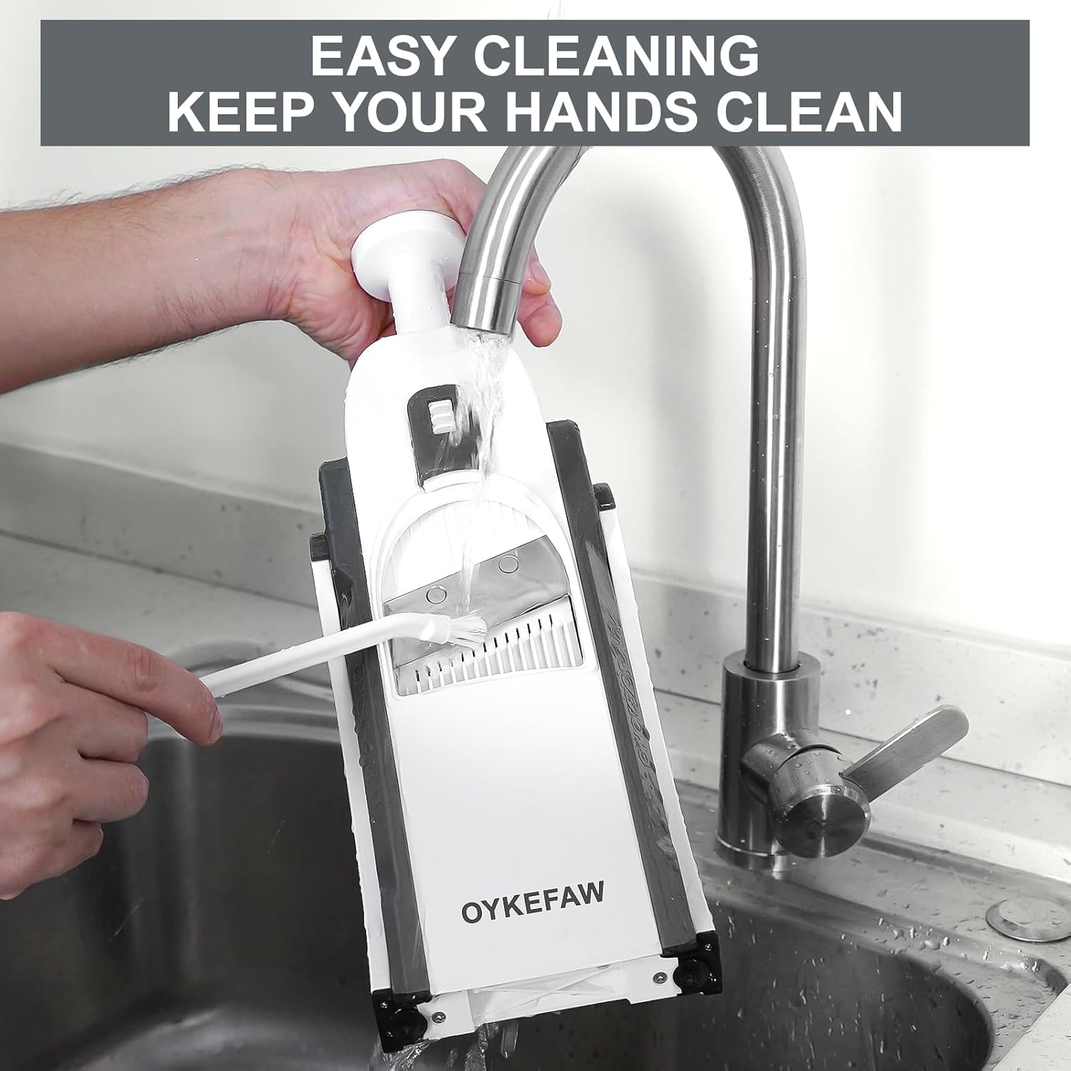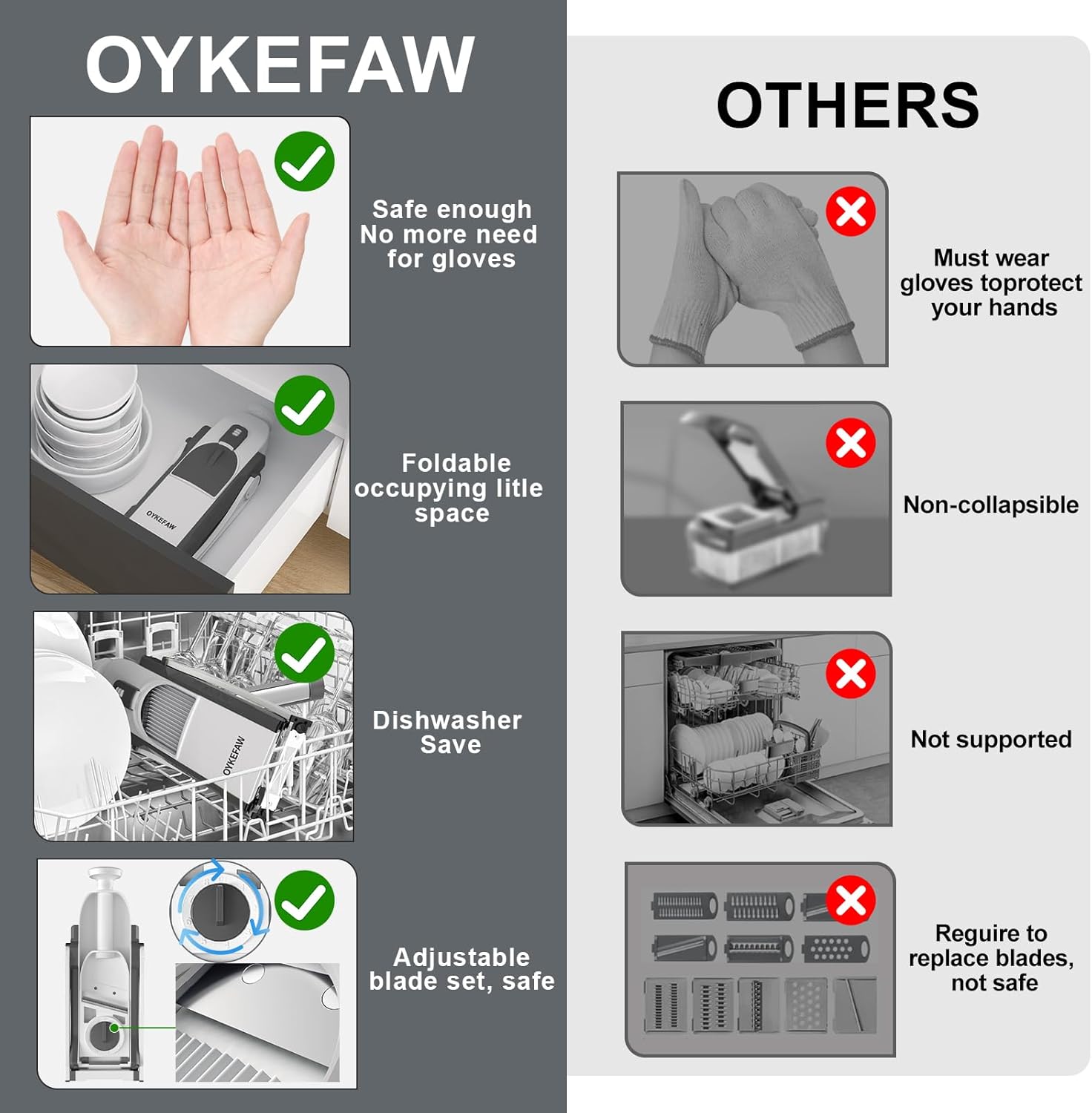 - Genuine, only by OYKEFAW. Safety Mandoline Slicer: Safety mandoline slicer for any cook. This mandoline slicer with build-in blades design, no need to touch the blades, safe & quickly slicing vegetable & fruits, easy to set up and clean up.