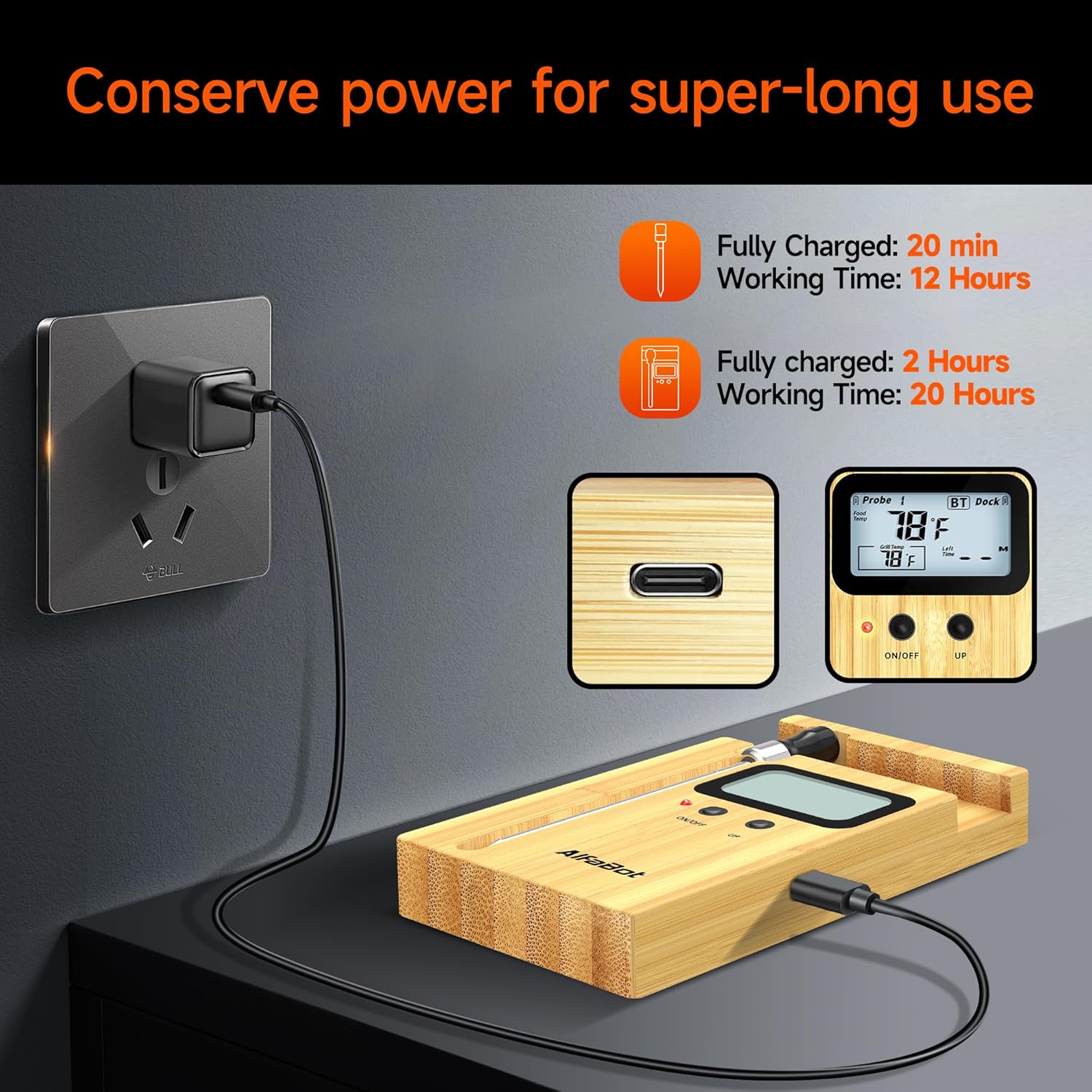 - 【Long-lasting and 𝗦𝘂𝗽𝗲𝗿𝗶𝗼𝗿 𝗗𝘂𝗿𝗮𝗯𝗶𝗹𝗶𝘁𝘆】The meat thermometer digital wireless probes can withstand extreme temperatures up to 572°F, making them ideal for high-temperature cooking. The wireless thermometer has a Type-C port and can be quickly charged.A full charge can be used for more than 12 hours to meet long-term cooking needs