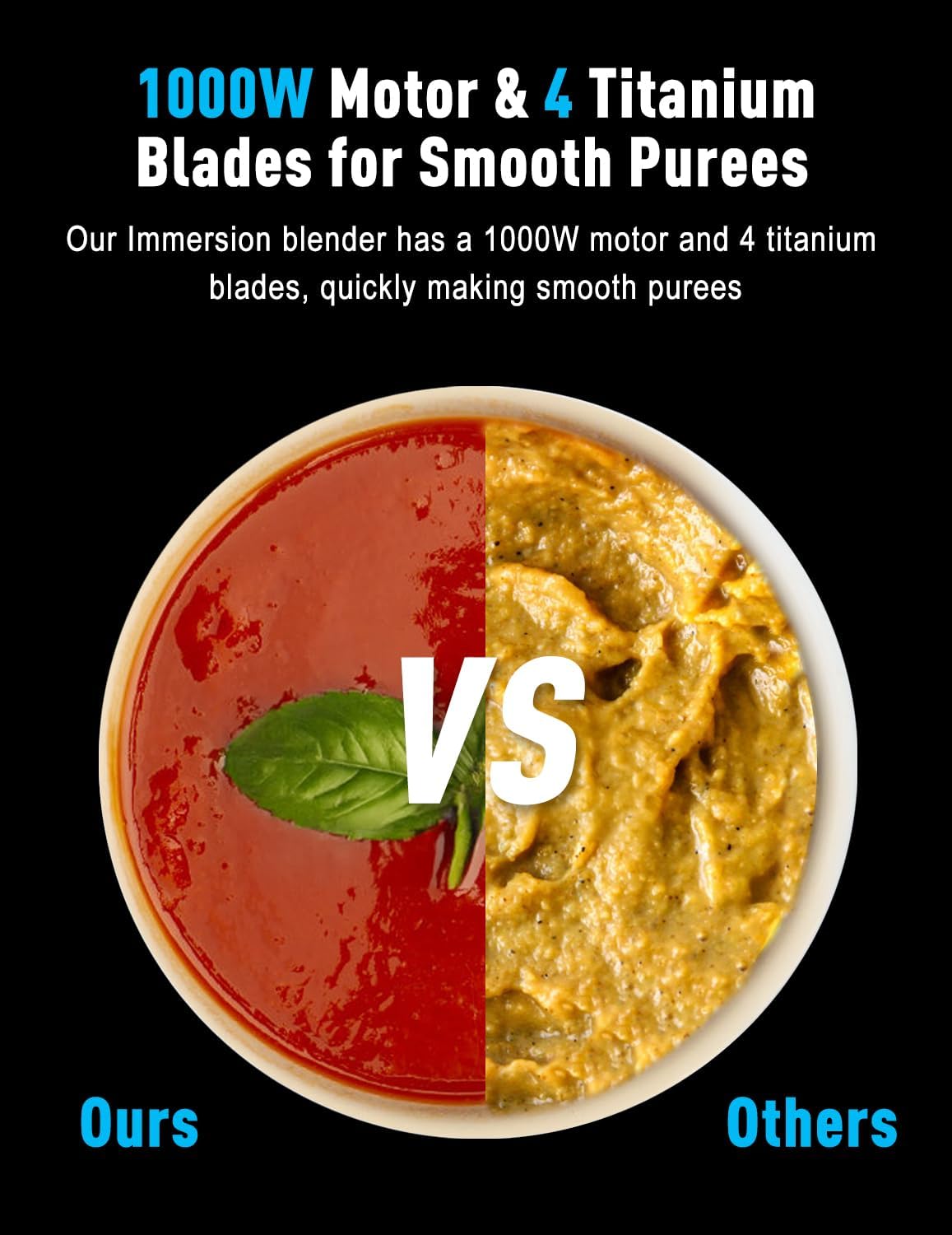 - ă1000W High-Power MotorăOur 2025 Immersion Blender, powered by a 1000W pure copper brushless motor, effortlessly crushes even the toughest ingredients. Designed for power and durability, it ensures smooth, consistent results with every use.