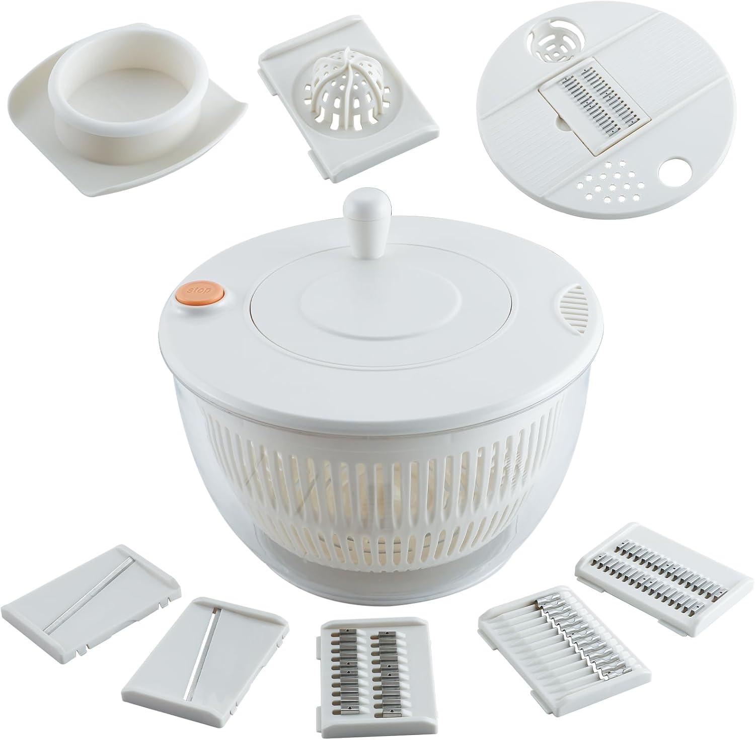 - 9 IN 1 Multifunction Kitchen Tool:Our Lettuce Spinner has 9 functions.It is a combination of a mandolin slicer and a salad Spinner.You can use it to squeeze lemon juice, separate eggs, wash vegetables, grind garlic, slice ingredients, and shred ingredients