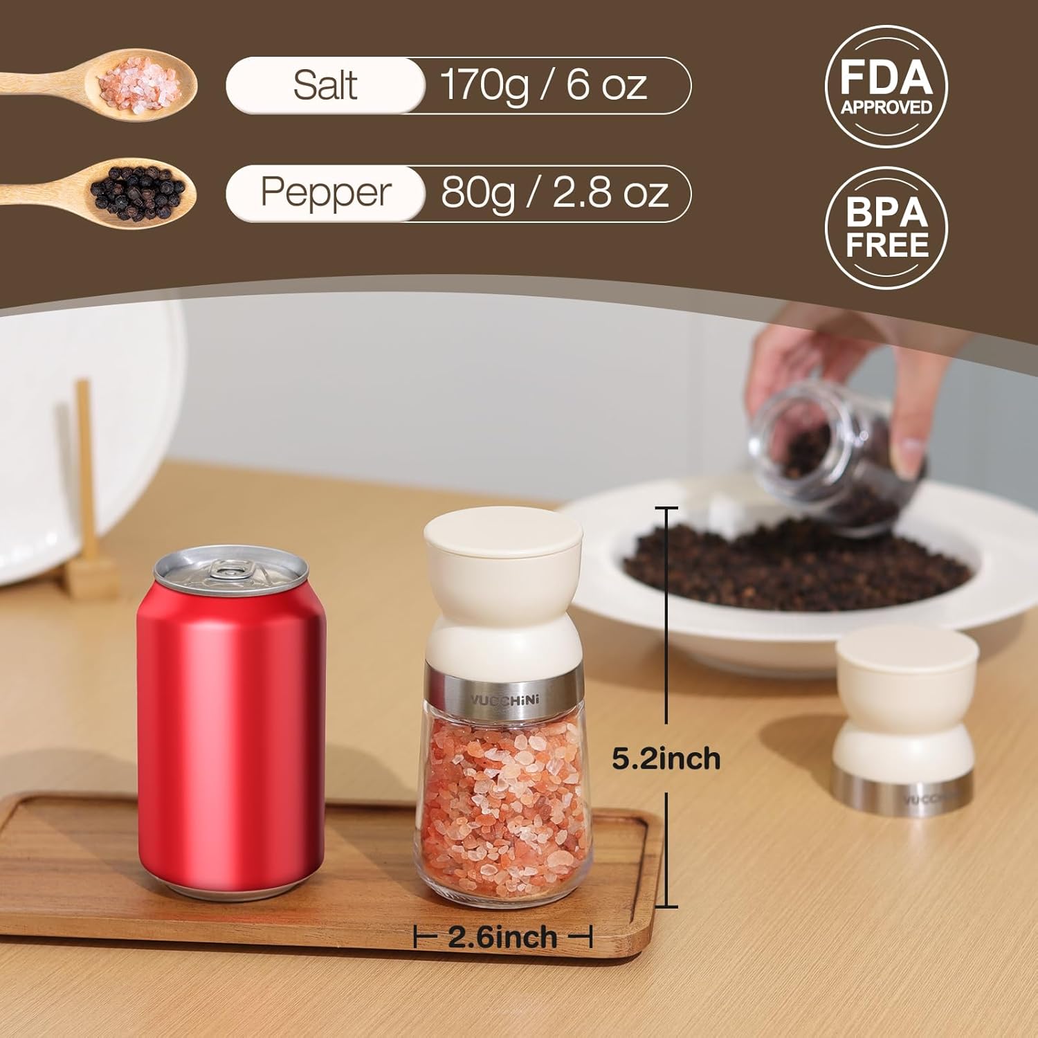 - Large Capacity, Easy Refilling - With large capacity, these salt and pepper mills hold up to 6 oz (170 g) of salt or 2.8 oz (80g) of pepper. Ideal for grinding a variety of spices including white and black pepper, mixed peppercorn, himalayan pink salt , sea salt and more spices