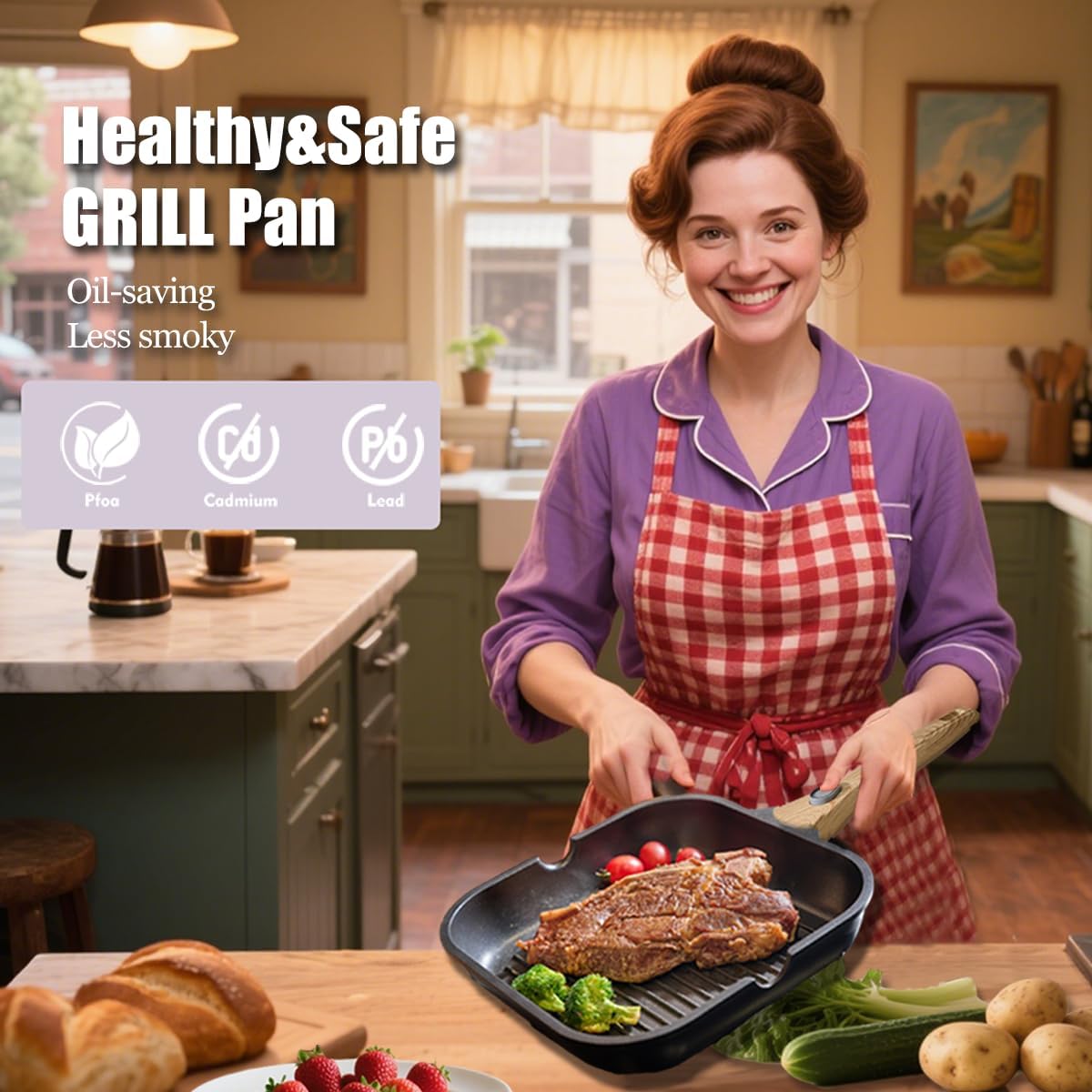 - 【Non-toxic and Non-stick】This grill pan is made of aluminum alloy and granite coating, which is non-toxic and lead/cadmium/PFOA free,Keeping you away from harmful chemicals