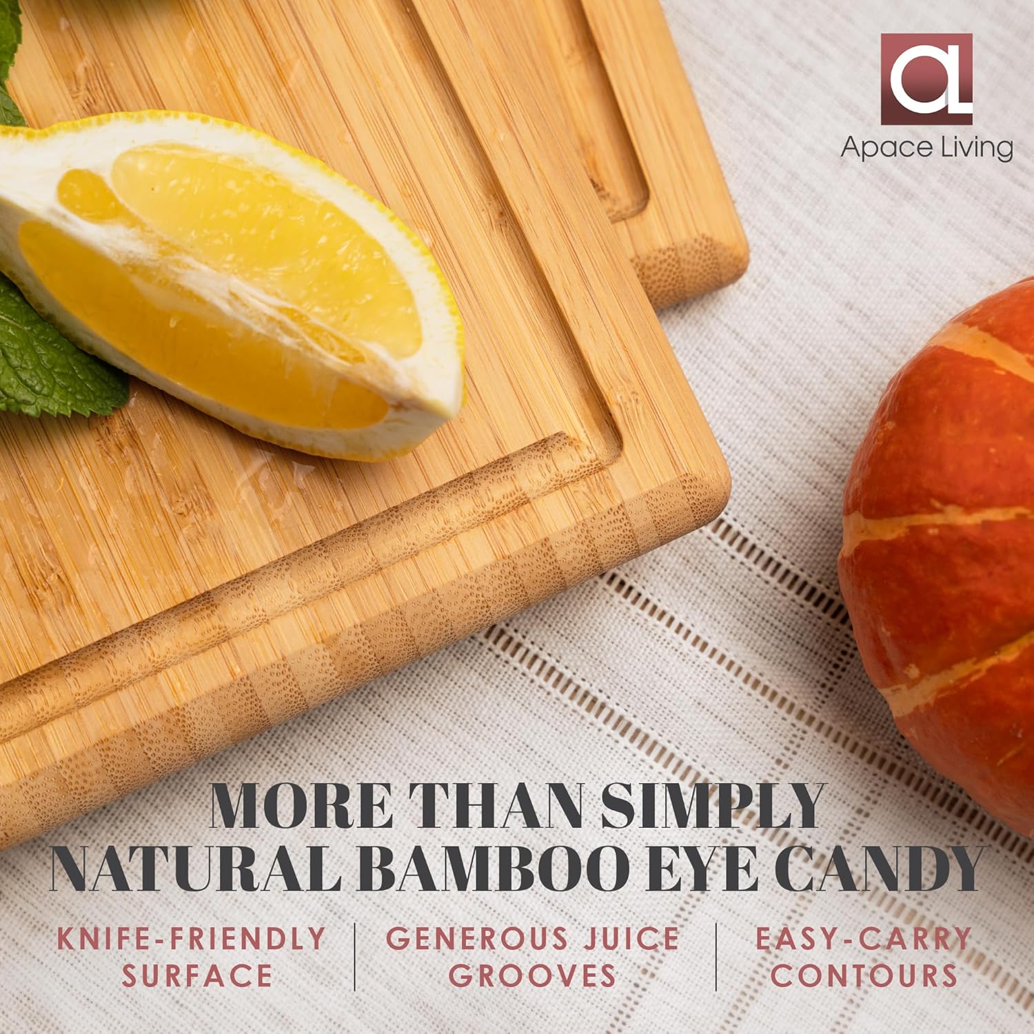- KNIFE-FRIENDLY SURFACE WON’T DULL YOUR KNIVES: Our practical cutting boards for kitchen and home are kind to your knives and won’t show scratches and marks. Deep juice grooves in the stylish bamboo wood catch all your meat and fruit juices. Perfect for maintaining a clean workspace, sharp knives, and an organized kitchen full of options.