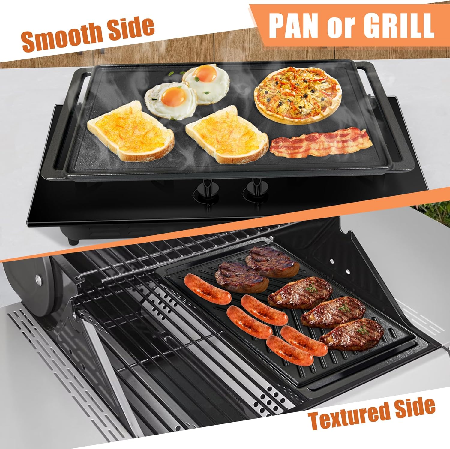 - STURDY AND DURABLE: This griddle pan is made of durable heavy-duty cast iron with a non-stick surface, high temperature, rust and corrosion resistant, sturdy and durable, providing you with your favorite outdoor grilling flavors and unmatched heat retention, even heat distribution and fast heat conduction for outstanding cooking results