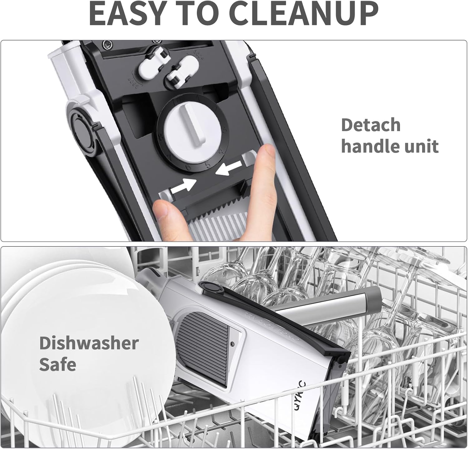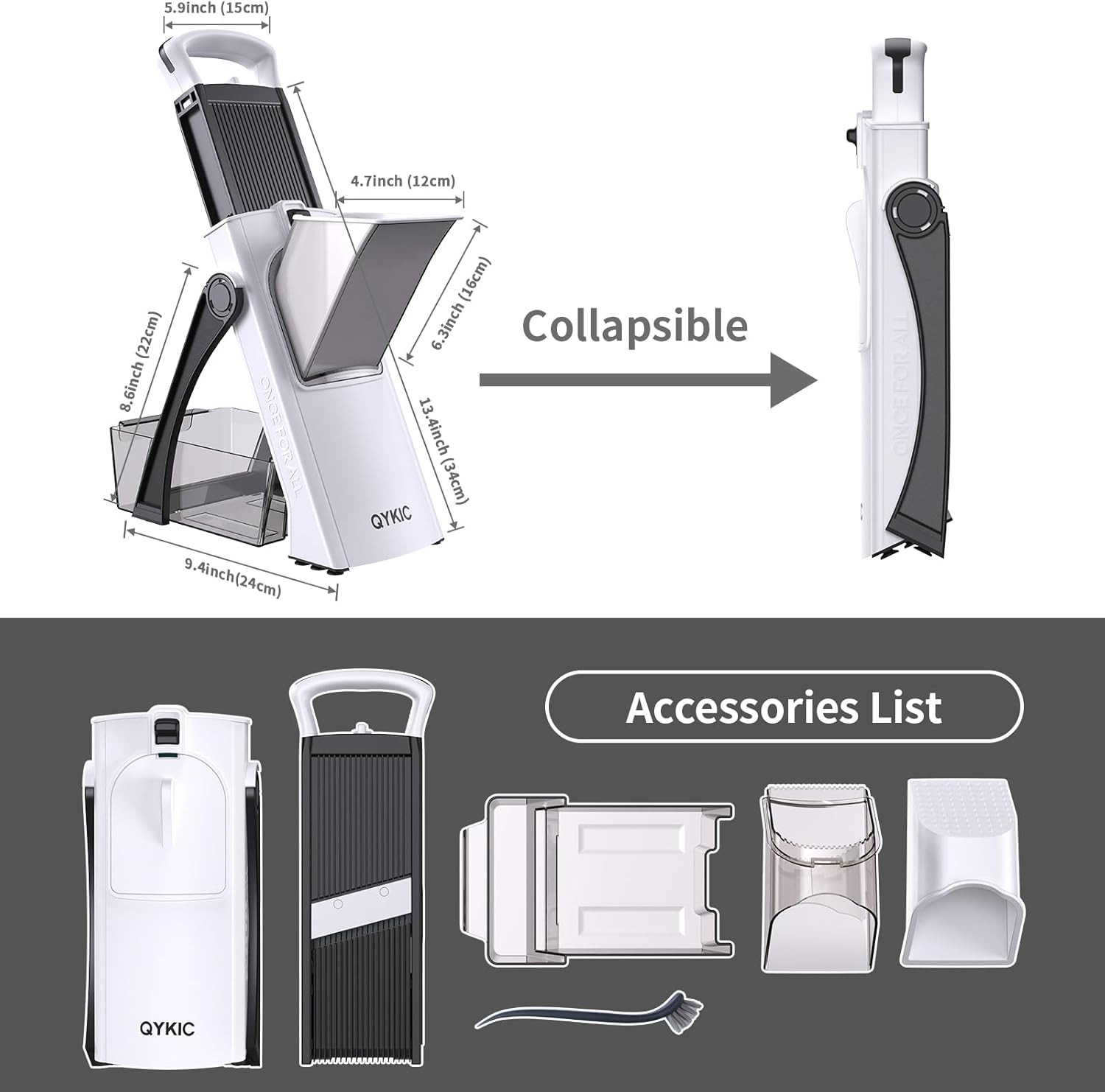 - ✅MULTIFUNCTIONAL : QYKIC vegetable chopper and slicer with 100+ slicing options, the mandoline slicer cuts perfectly-even slices from 0.2-8mm in thickness while also offering julienne, matchstick and dicing options. suitable for cutting potatoes, garlic, onion, carrot, cucumber, vegetables and fruits. tips: please do not cut meat.