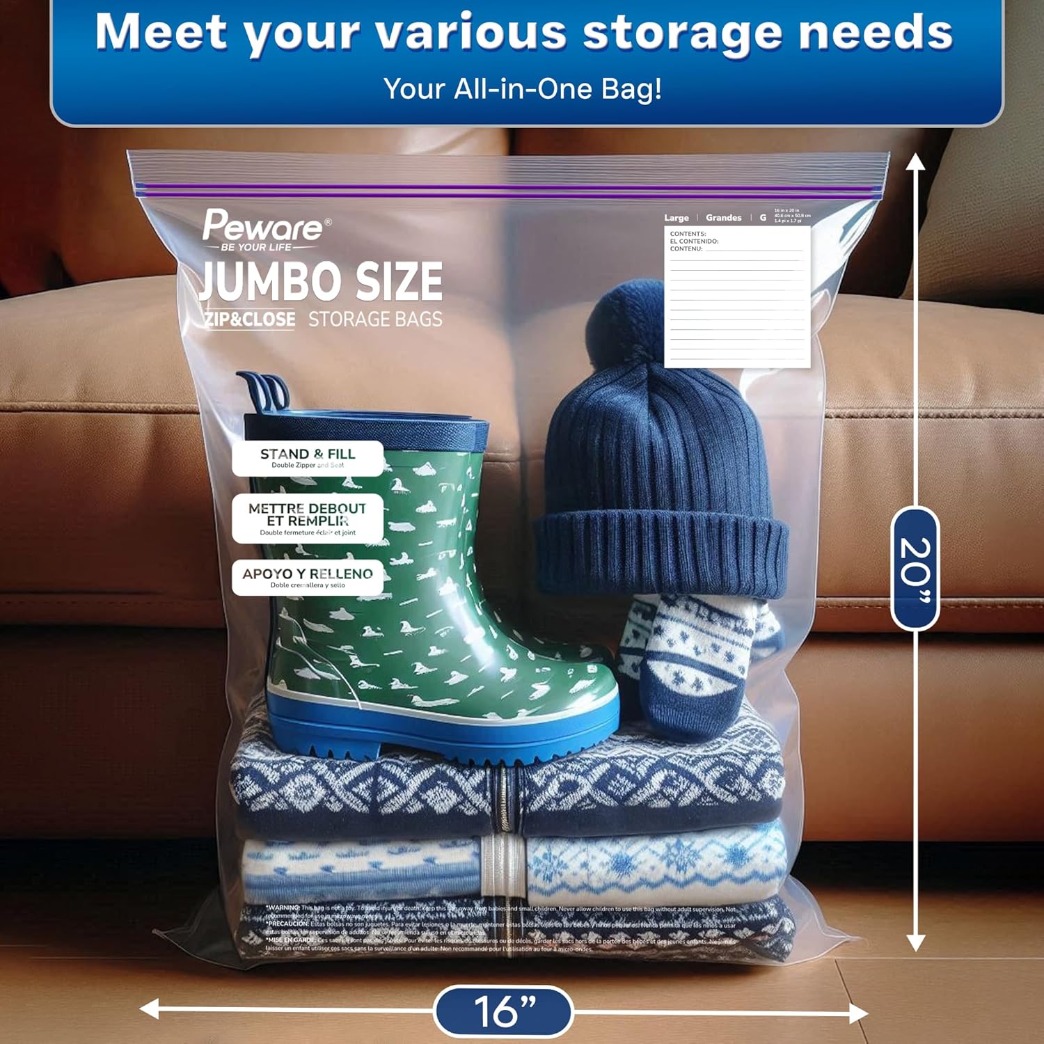 Large Storage Bags, 16"x20" Jumbo Plastic Bag, BPA Free, 3.5 Gallon XL Zipper Lock Baggies for Clothes Pillow Travel Moving - 30 Roomy Bags