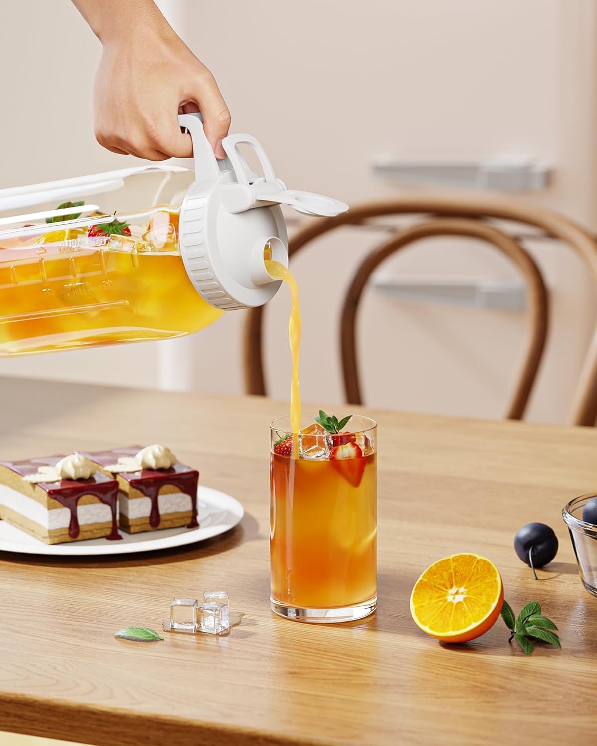 - Simple and Convenient: The pitcher features a thickened, ergonomic handle that supports the weight of a full jug, making it easy to hold and pour. The spout is designed for easy pouring with precise control, and includes a lid that stays securely in place, preventing spills