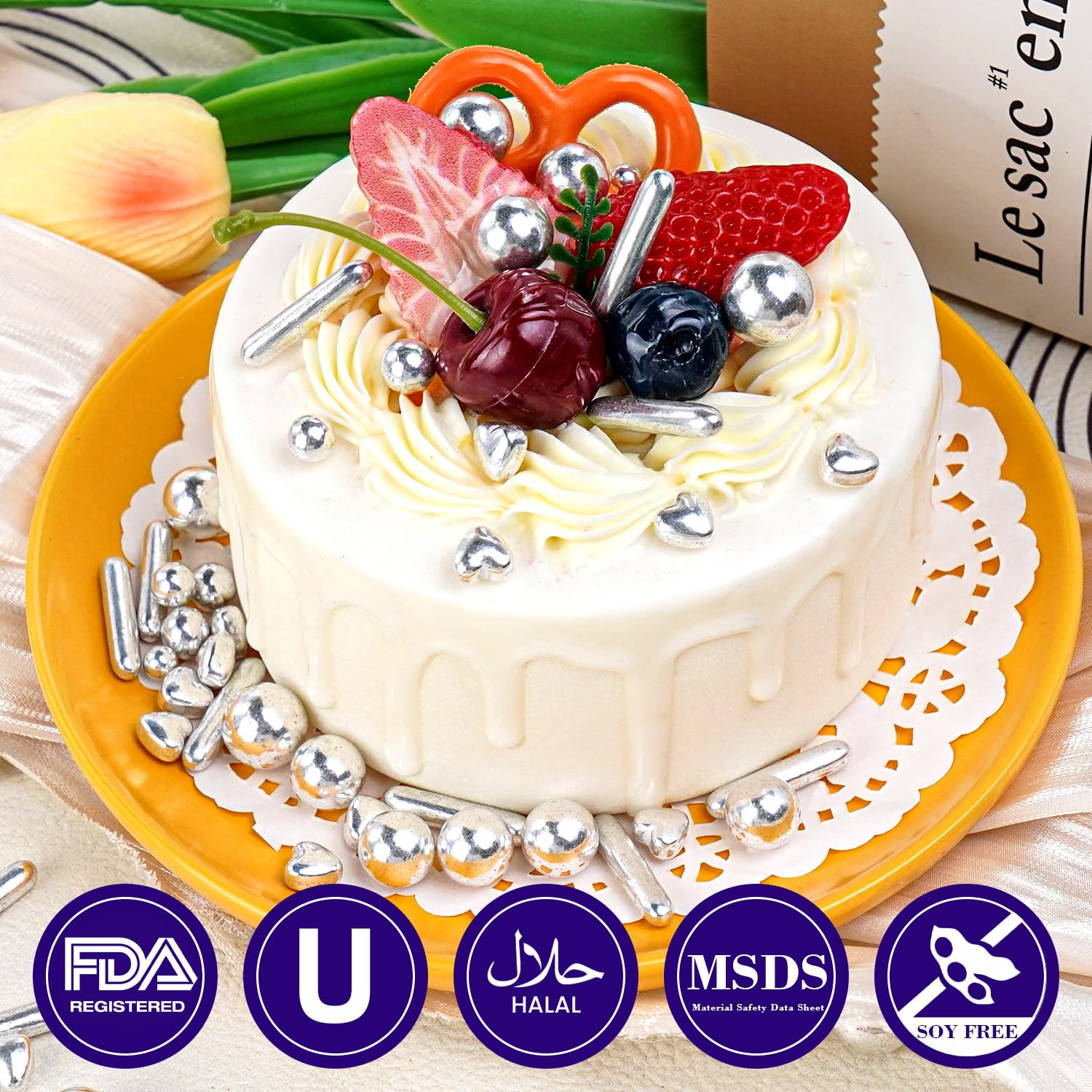 Dazzjoy Edible Silver Pearl Heart Rods Sprinkles, 130g/4.58oz, Mix Size, Silver Pearl Sprinkles for cupcake decorating, Cupcake Toppers Cake Decorations