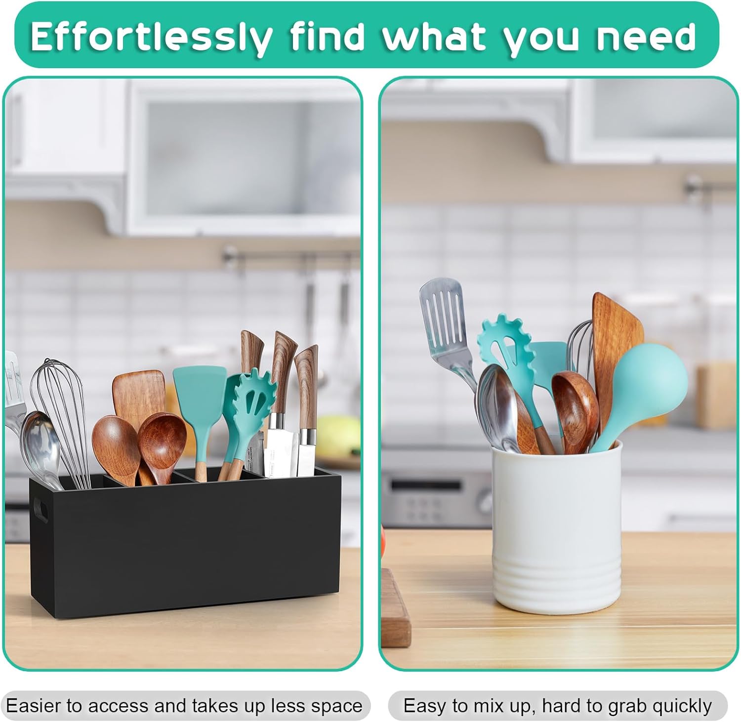 - Clutter Free Storage - Our 4-compartment utensil holder allows you to organize your most frequently used kitchen utensils based on different materials, saving drawer or countertop space and making your cooking tools easily accessible.