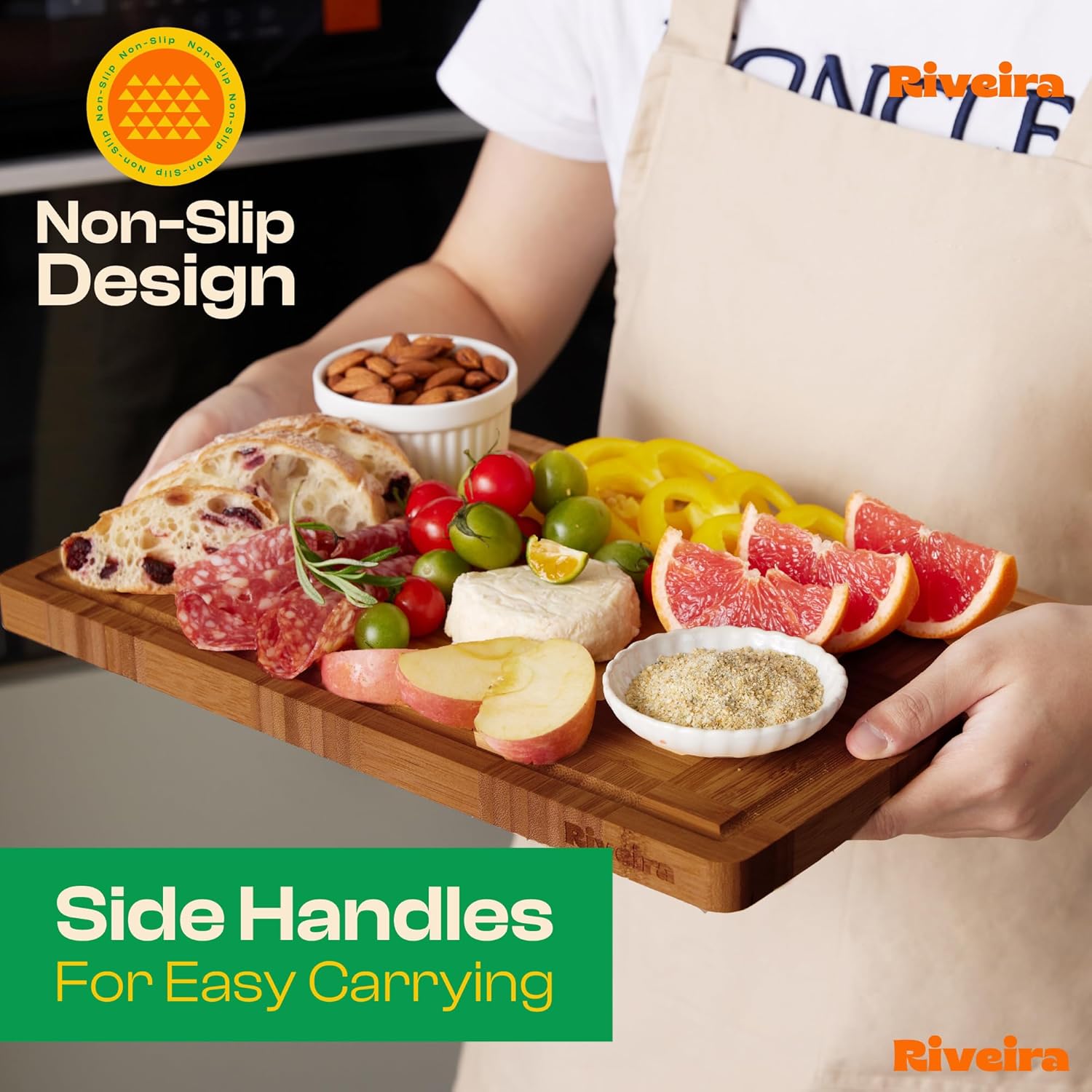 - Premium Crafted Bamboo — Take a detour from traditional kitchen aesthetics with this bamboo wood board crafted from 100% natural bamboo. Beyond being an unconventional and eco-friendly choice, the chopping board wood proudly showcases the environment friendly and organic bamboo. This wood cutting boards for kitchen counter adds an unexpected touch of confidence and style to your once-orderly culinary space. Riviera's wooden chopping boards for kitchen will be there for you.