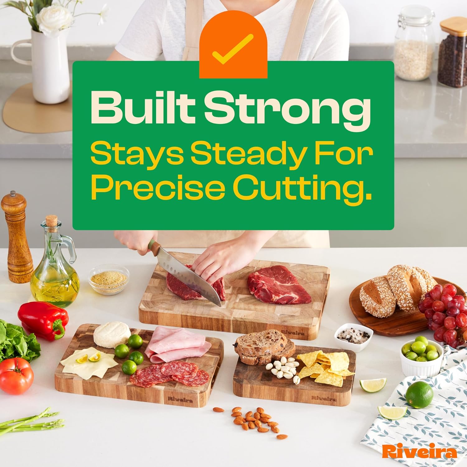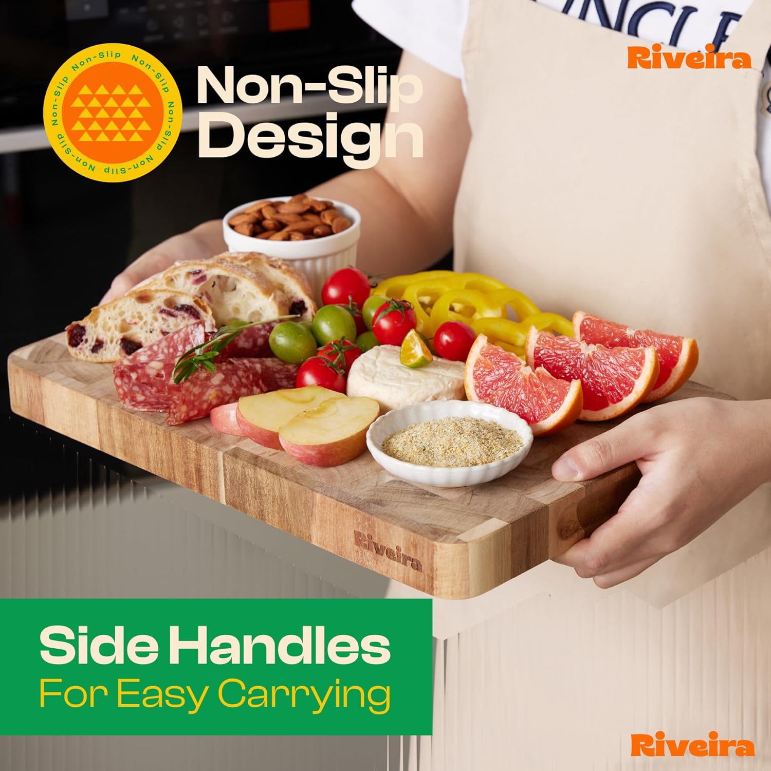 - Functional Addition — Beyond its apparent function, this butcher board serves as the greatest addition to your kitchen. Perfect for serving, big wood cutting board transforms into a charming charcuterie board for gatherings. Place the acacia cutting boards for kitchen on the stove or kitchen island to create additional countertop space when needed. These sturdy and durable 18 x 12 cutting board butcher block showcase its versatility in various culinary scenarios as the biggest help.