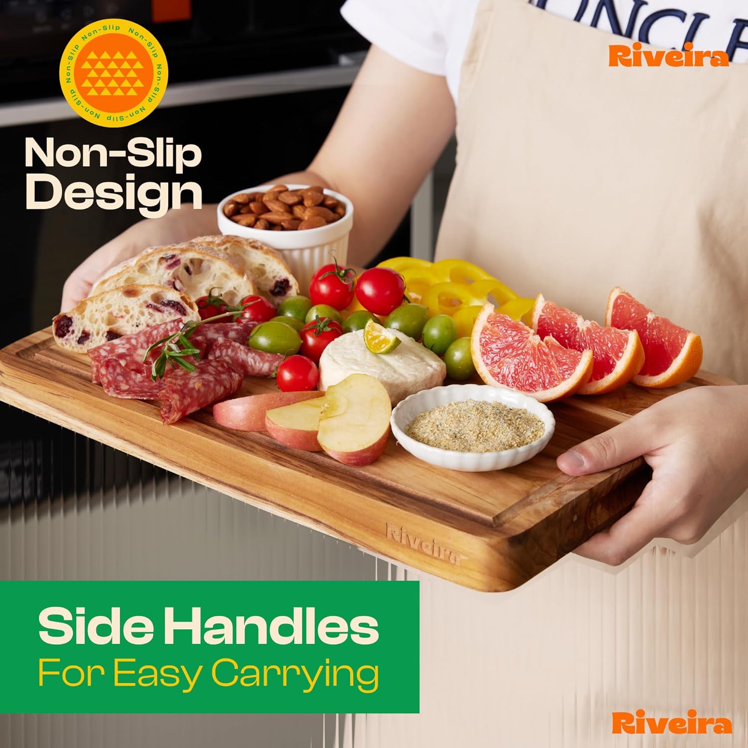 - Premium Crafted Teak — Take a detour from traditional kitchen aesthetics with this teak wood board crafted from 100% natural teak. Beyond being an unconventional and eco-friendly choice, the chopping board wood proudly showcases the environment friendly and organic teak. This wood cutting boards for kitchen counter adds an unexpected touch of confidence and style to your once-orderly culinary space. Riviera's wooden chopping boards for kitchen will be there for you for many years to come.