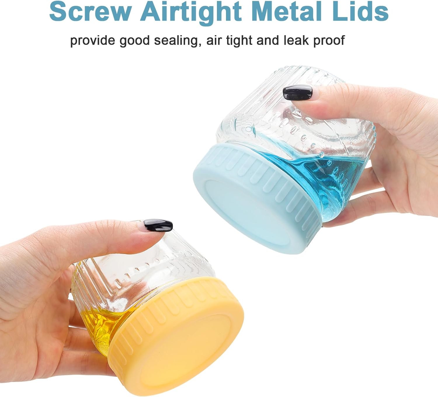 - Package Include: 6 Pack 8 oz/120 ml mason jars with colorful lids and labels. This mason jar have an elegant design and the transparent glass can clearly distinguish what is inside