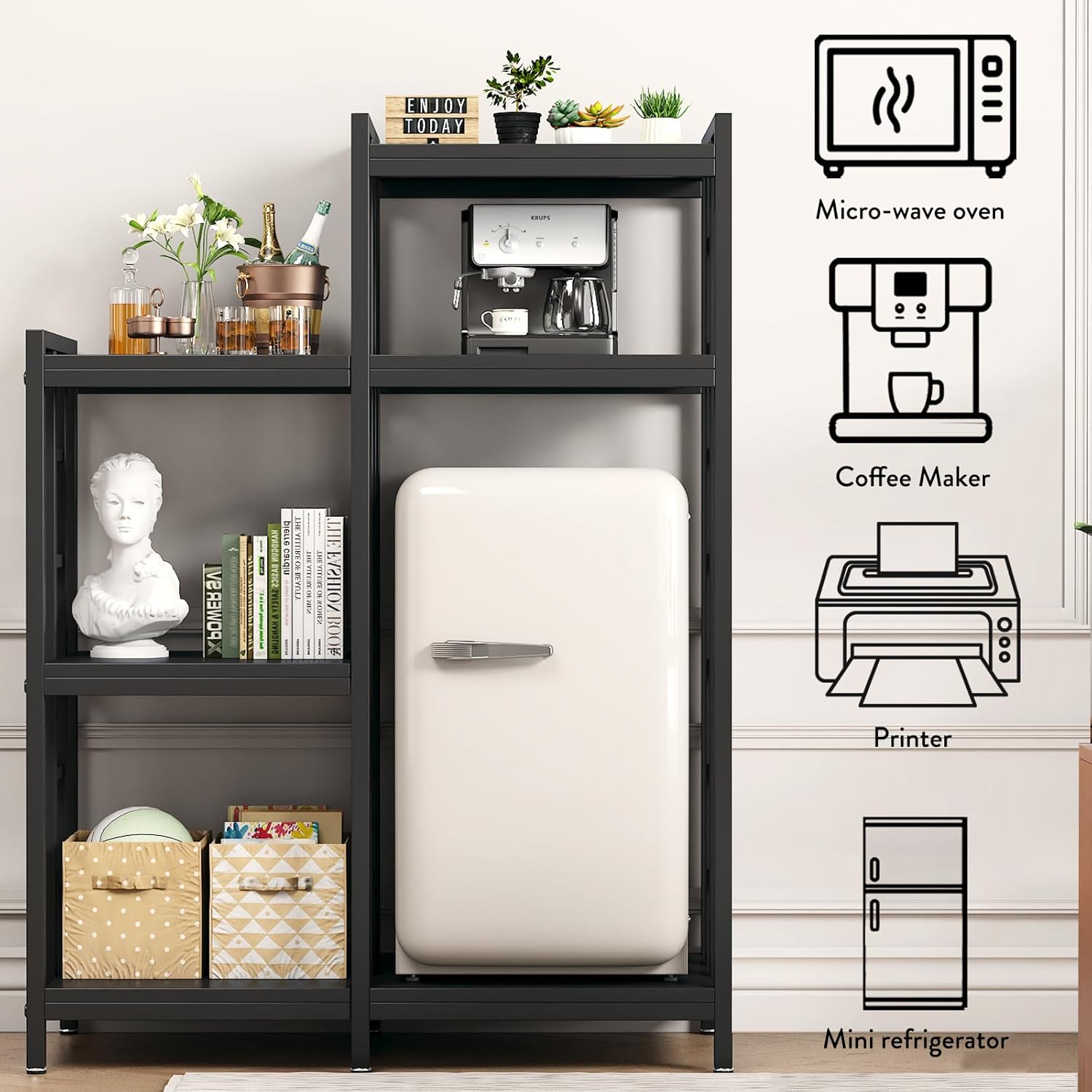 - Removable Shelf kitchen stand: Can store higher mini-fridges on bakers rack with storage? Of course. Just install shelves to different pre-drills for different storage heights. Spacious open 3-tier shelves totally hold your coffee maker, microwave, and spice pots