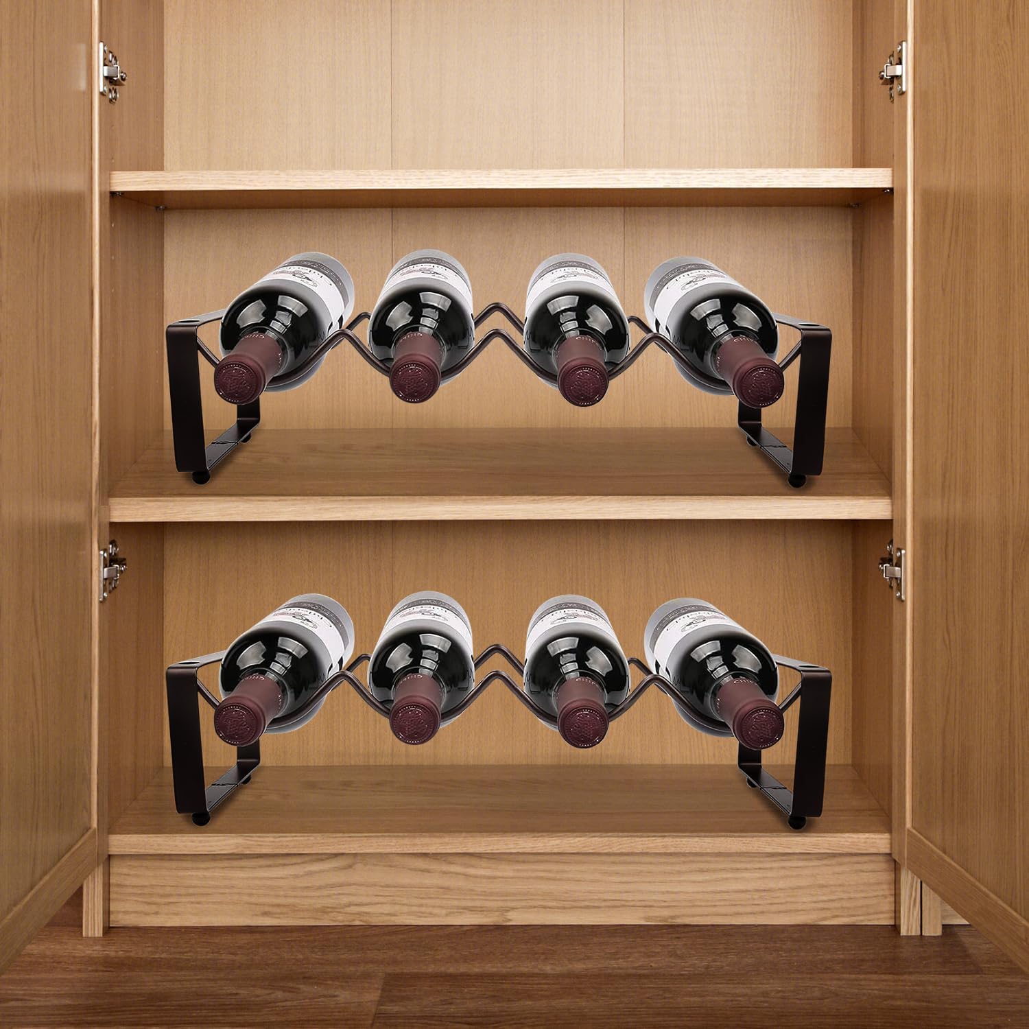 - Stackable Wine Cabinet Counter: 2 Tier Wine Rack which is layered design which you can use alone or stack it to 2 tier. And 1 set can hold 8 standard bottles (2 rows X 4 bottles, 750 ML).