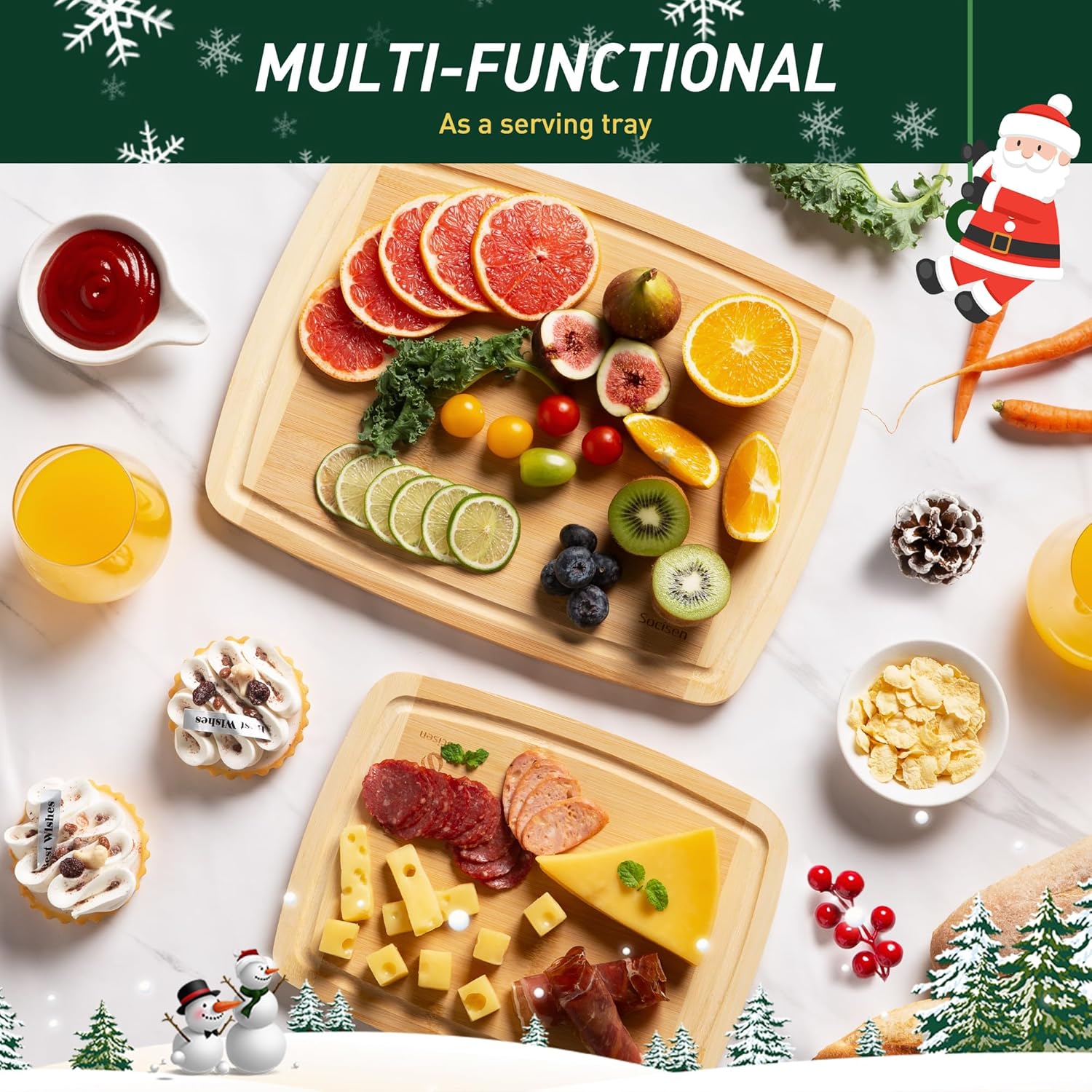 - Two Perfectly Sized for Versatile Use: Our bamboo cutting board set has two sizes – 11"x8.5", and 14.5"x11". The medium is for quick chopping and larger meal prep, the large for slicing meats or serving. Thoughtfully sized to fit different needs without taking up too much counter space. Whether dicing veggies, slicing fruits, or carving meats, there's a chopping board for every occasion. Perfect for various kitchen tasks and charcuterie boards.