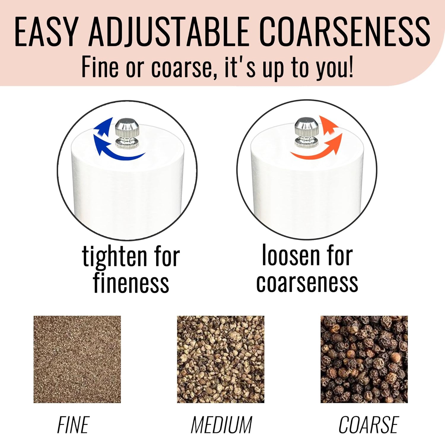 - ADJUSTABLE COARSENESS - Our twist salt pepper grinder set has an adjustable ceramic grinder head. Simply Twist the Top Knob to adjust to your preference. Tighten for Fine Spices and Loosen for Coarse Spices.