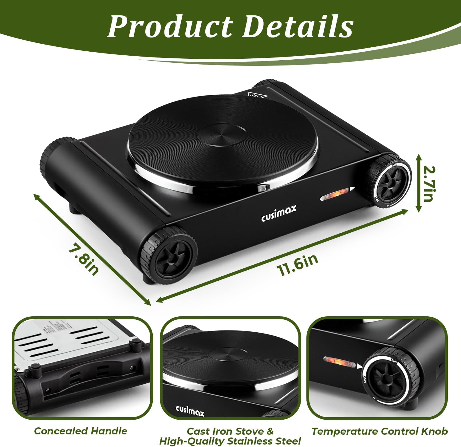 Cusimax Hot Plate,1500W Hot Plate Electric with 7.4″Cast Iron Countertop Single Burner,Electric Stove Top Burner for Cooking,Temperature Controls,Black