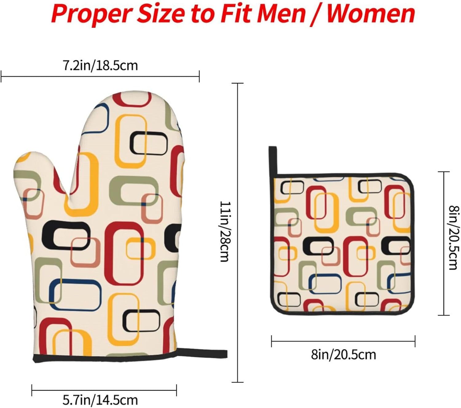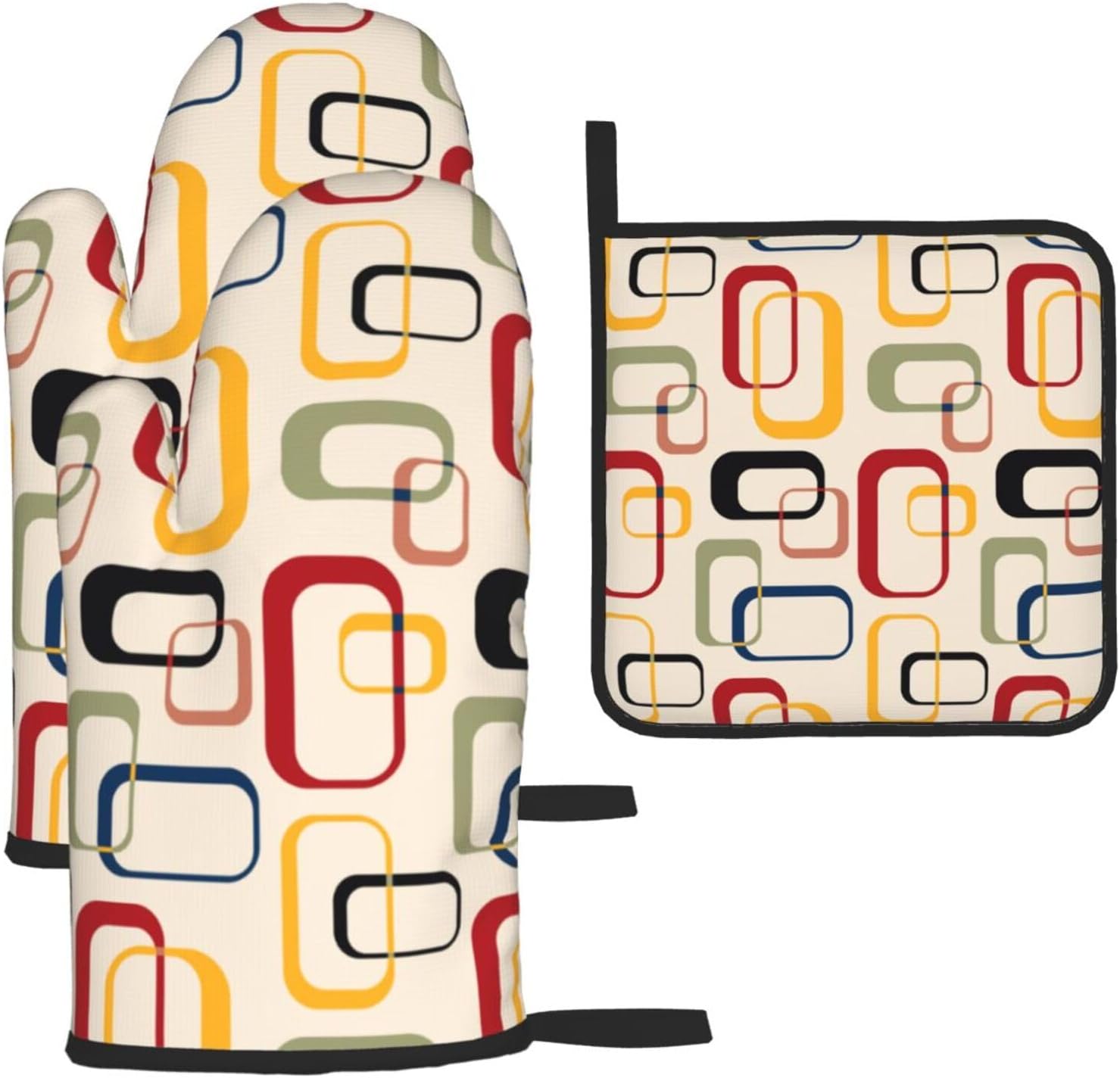 Mid Century Modern Retro Oven Mitts and Pot Holders Sets of 3 Vintage Decorative Heat Resistant Non Slip BBQ Gloves for Cooking Grilling Baking Kitchen Decor