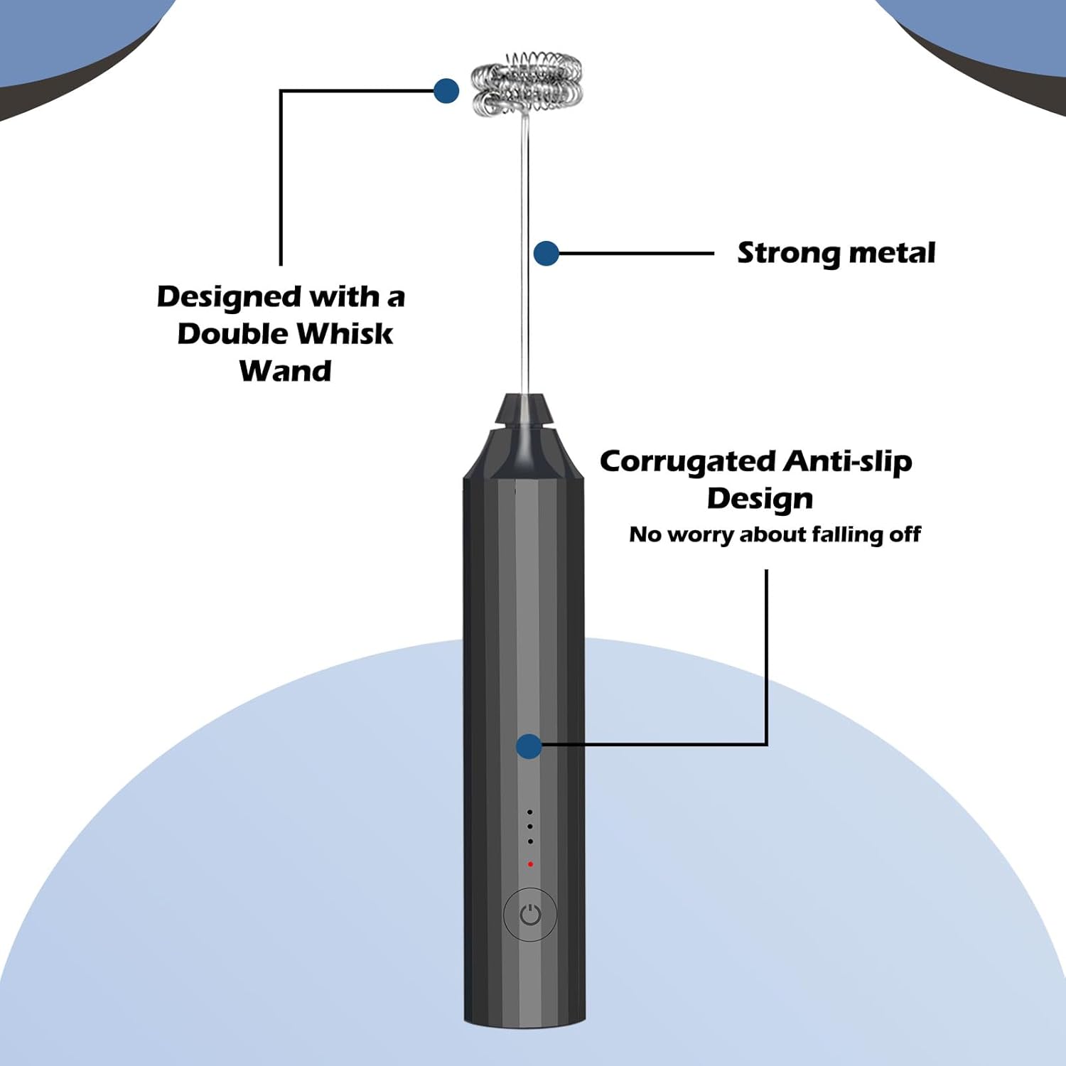 - 【Double Whisk Wand & 3 Speed Adjustable】: 3 adjustable whisk speeds available for more options.Press the on/off switch to make the milk frother work with blue light. Continue to press the on/off button, the speed will switch between low speed, medium speed and high speed. Frother wand rechargeable could choose different speeds to achieve ideal frother effect.Designed with a double whisk wand, it increases the contact area with the ingredients, making the stirring more uniform and faster.