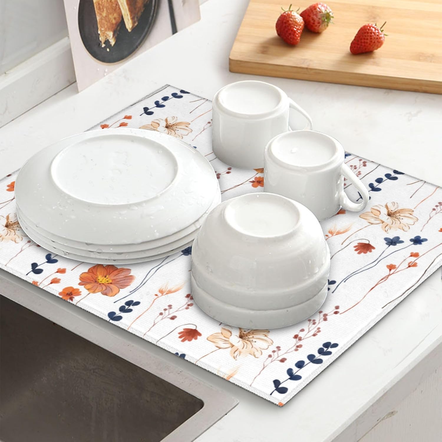 - Cute print can easily dress up your kitchen dining room. Drying pad suitable for draining racks to keep the counter dry and clean, or you can place pans, bowls, plates, pots, cups, bottles, tableware, ect