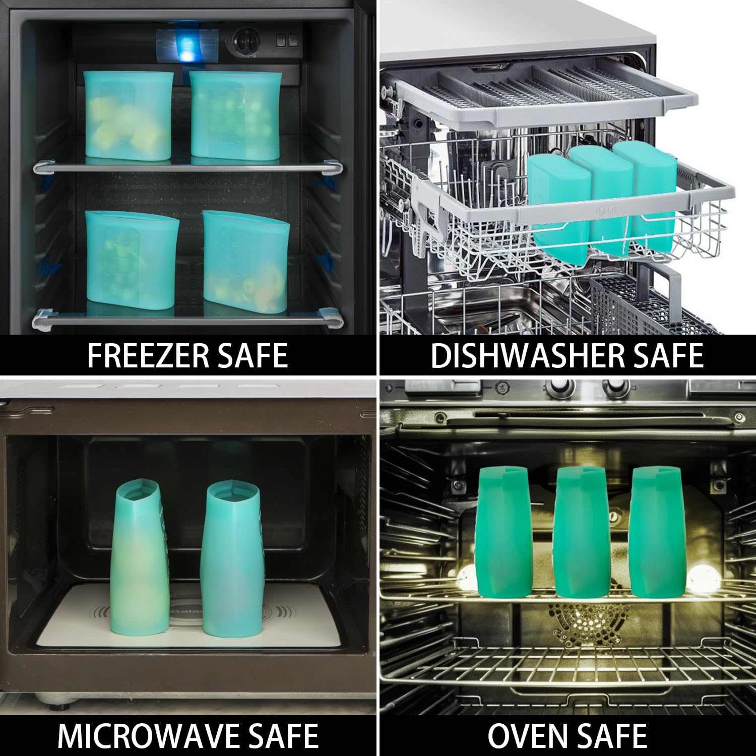 - ăDISHWASHER FREEZER MICROWAVE OVEN SAFEăTired of dealing with plastic bags?(PEVA is actually a type of plastic.) Switch to silicone bags reusable storage and spend less time worrying about saving leftovers safely. These reusable bags are non-toxic and safe for use in the Microwave, Freezer, Oven and Dishwasher. They can even withstand temperatures up to 428â, making them ideal for all your food storage needs