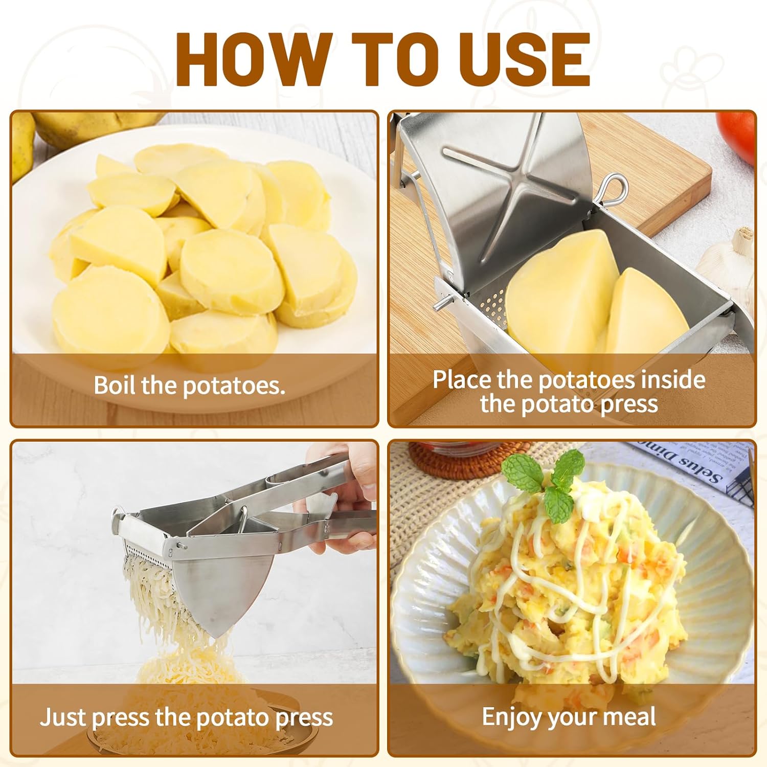 - 【Detachable Design, Easy to Clean】 The stainless steel potato ricer is stain resistant, corrosion-resistant, and deformation resistant. Any food residue can be easily rinsed off with running water.