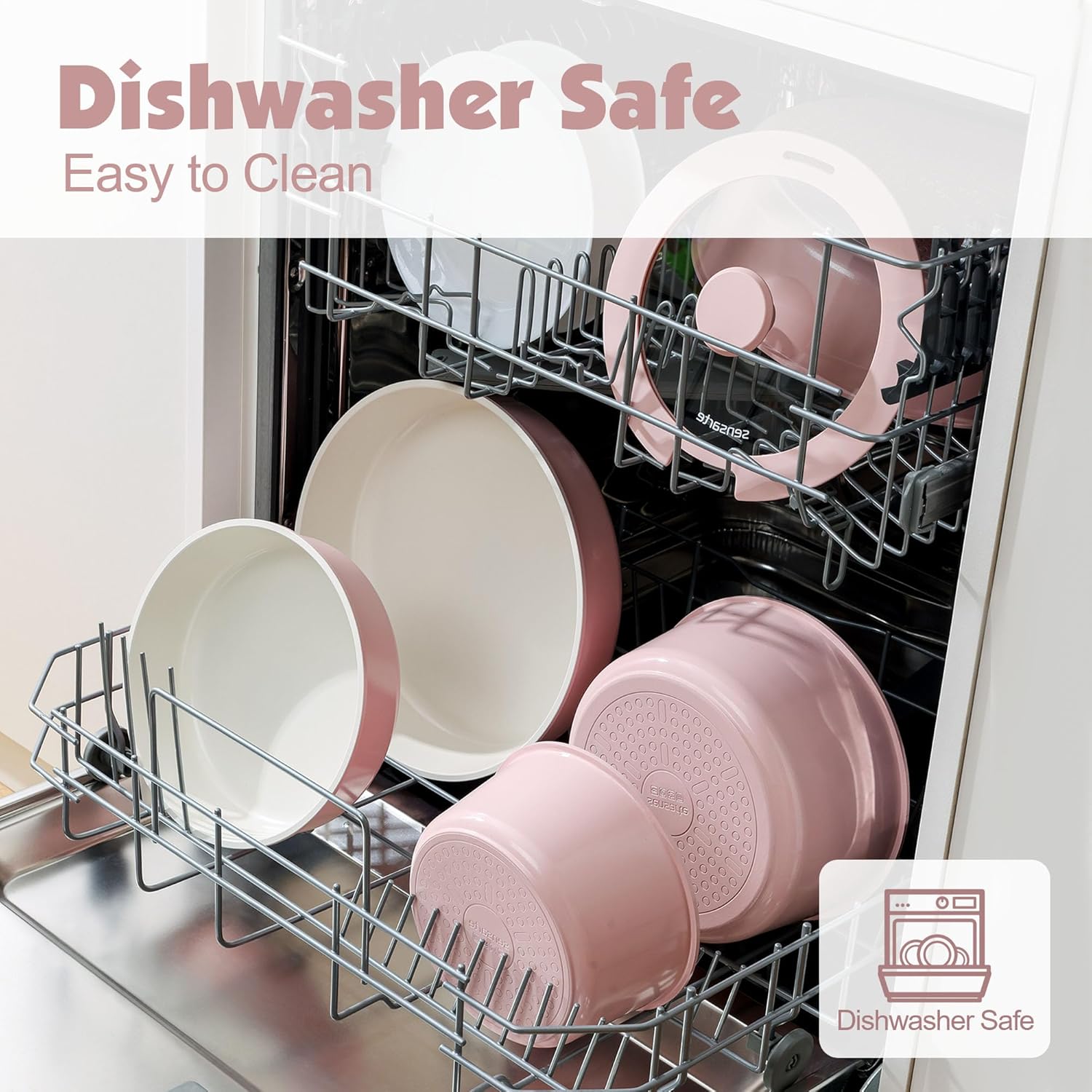 SENSARTE 17 Piece Ceramic Pots and Pans Set, Nonstick Detachable Handle Cookware, Induction Kitchen Cookware Set with Removable Handle, Dishwasher & Oven Safe (Pink)