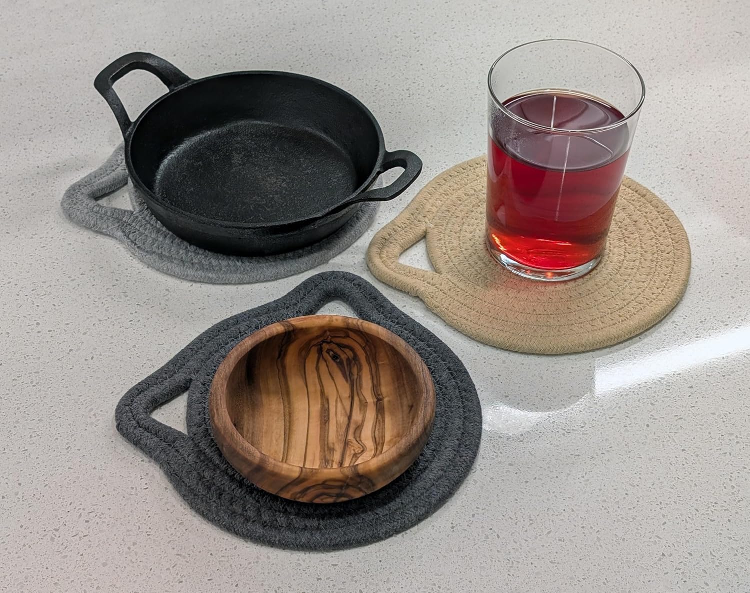 - Durable Materials: These trivets are made of woven cotton and are soft and flexible. Each trivet is about 7” in diameter and 0.3” thick.