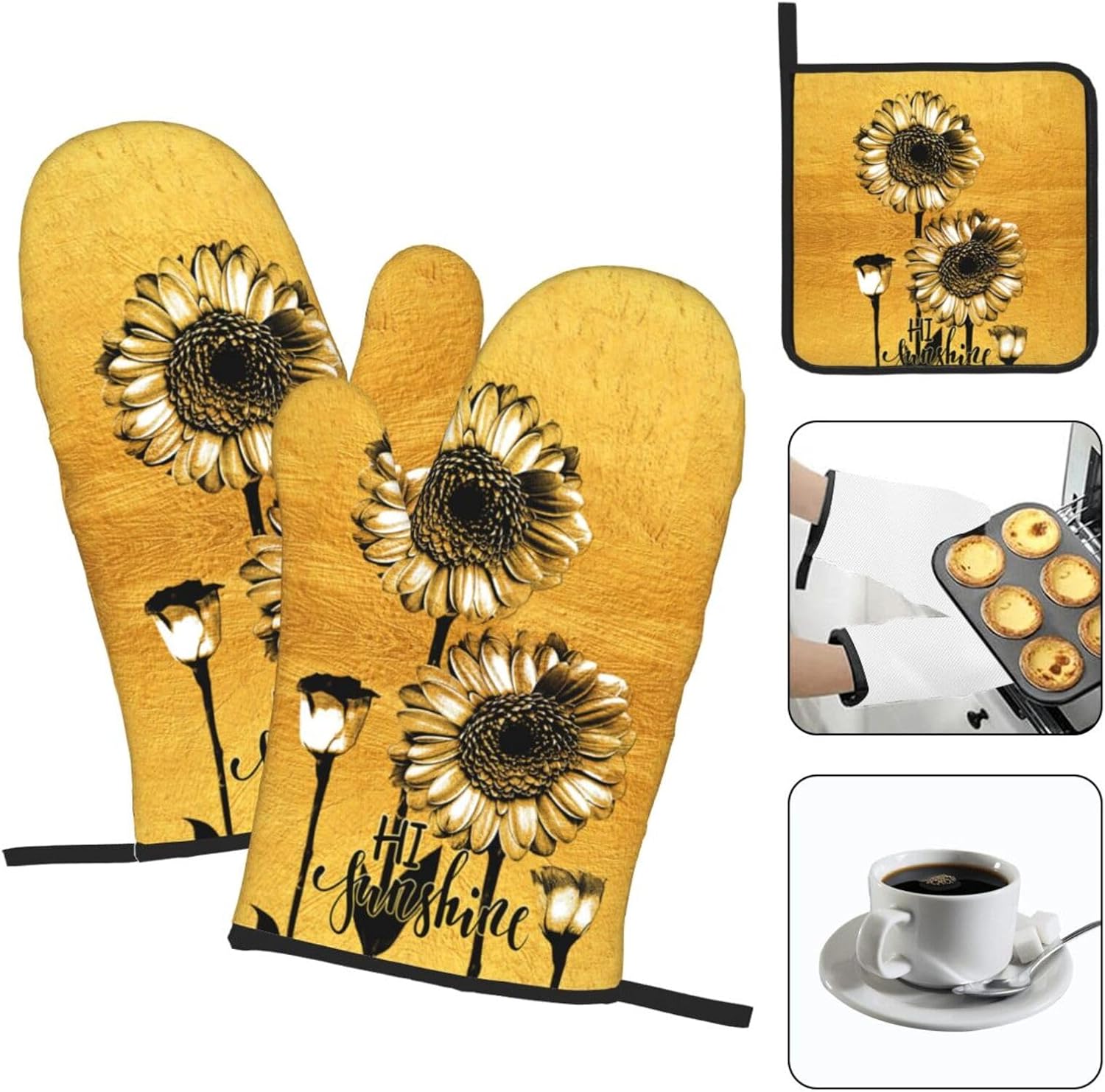 Sunflower Oven Mitts and Pot Holders Sets, Heat Resistant Gold Kitchen Oven Glove for Kitchen BBQ Baking Grilling Cooking, Sunflower Gifts for Women Cooks Bakers Cooking Lover